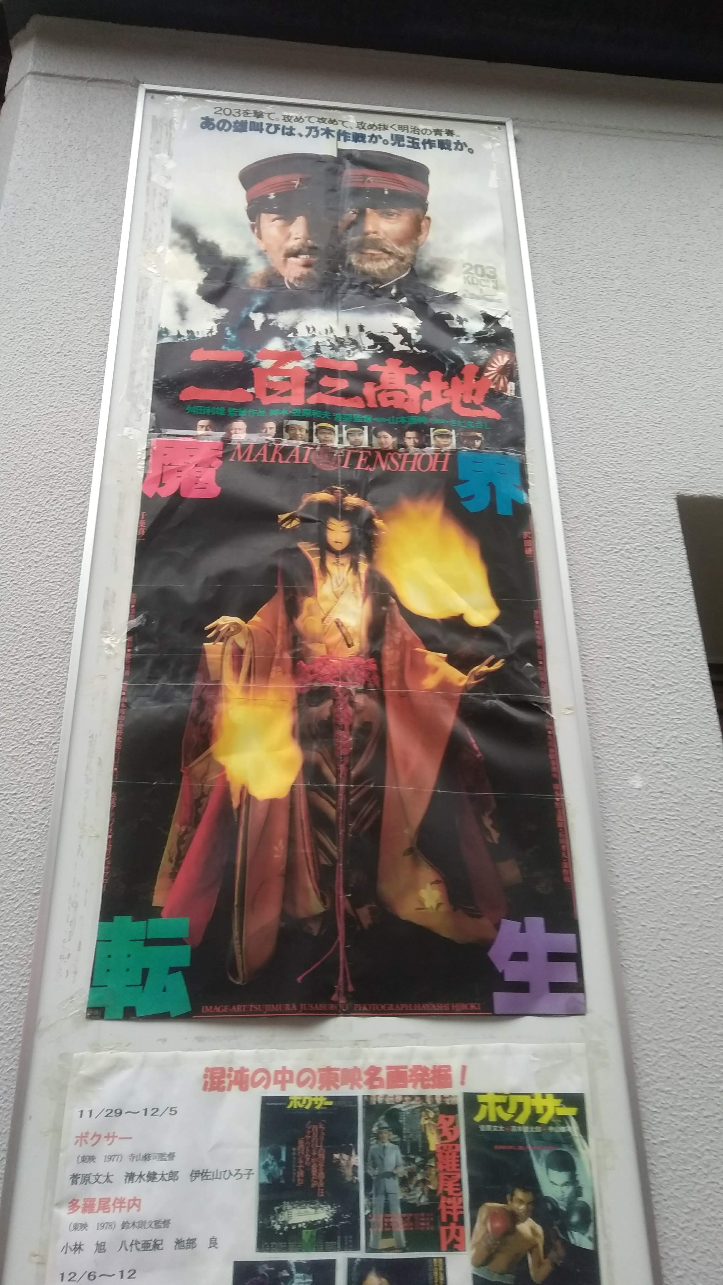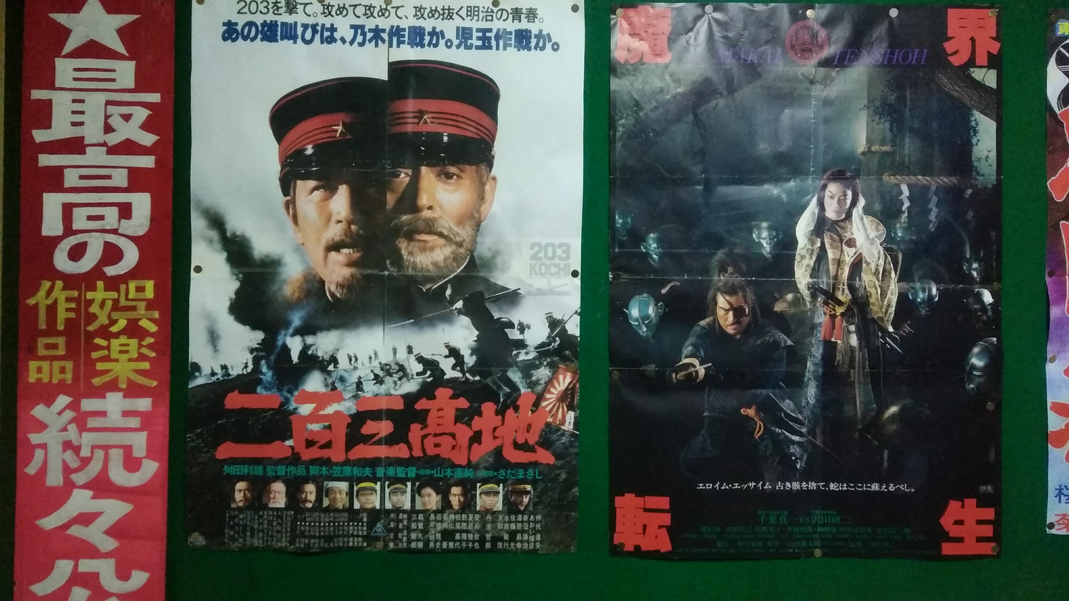 またしても80年代映画の話。引っ越しも二週間、生活もようやく安定して……というのは前回も書いたし、くどいので割愛。夜勤明けの朝、久々の新世界東映へ。今回は『二〇三高地』『魔界転生』の80年代東映大作映画。いずれも戦争映画と時代劇という、一時はすたれたジャンルを新時代に向けて新しい解釈で作った作品、と勝手に解釈する。しかし、二本合わせて5時間強という上映時間は新世界東映に通って初めてのことである。
