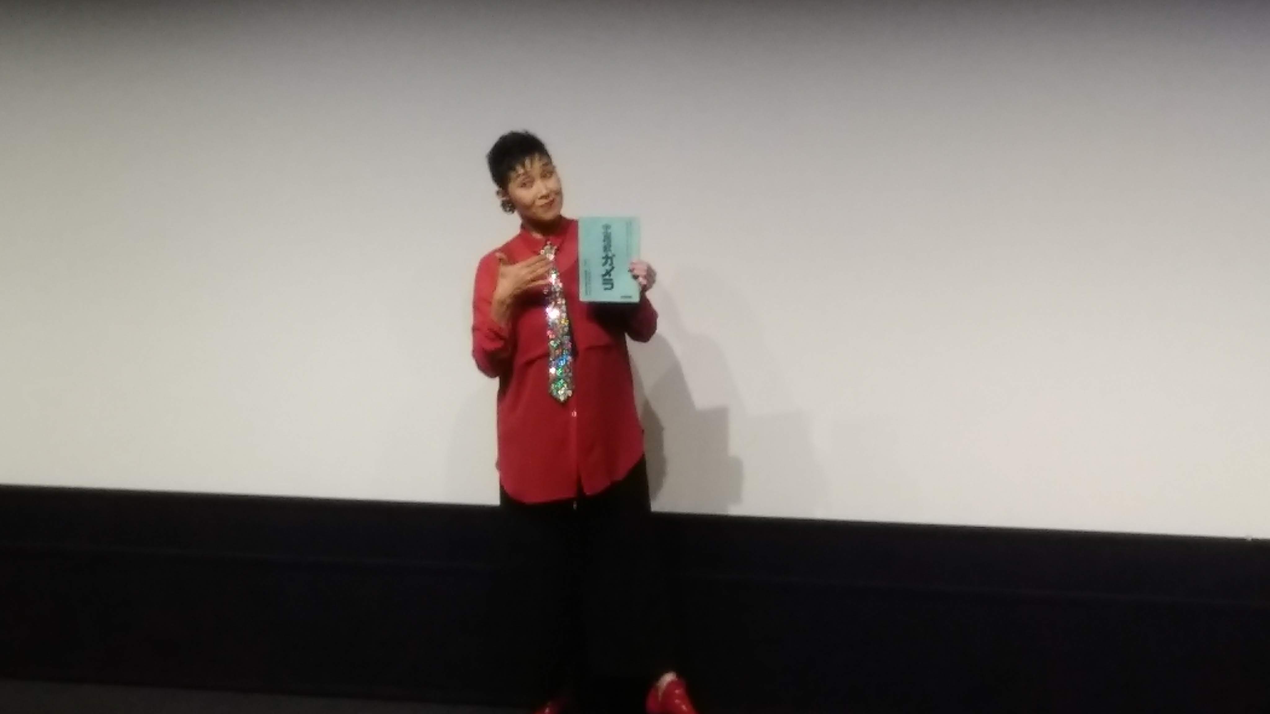 まずは『宇宙怪獣ガメラ』、その前にゲストの平和星人キララ役のマッハ文朱さん登壇。司会の木原浩勝氏、中村哲氏を相手に軽快なトークでガメラのこと、これまでの映画出演歴のことなど。タレント、そして元プロレスラー。客を煽り、沸かせるのが本当に上手でありました。そしてまさかの歌声&変身ポーズも! 完全に場内がマッハさんの色に染まっておりました。マッハ色ってなんだ?