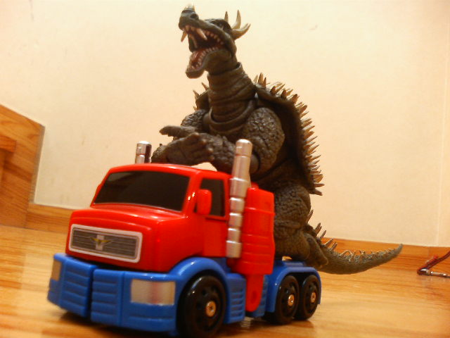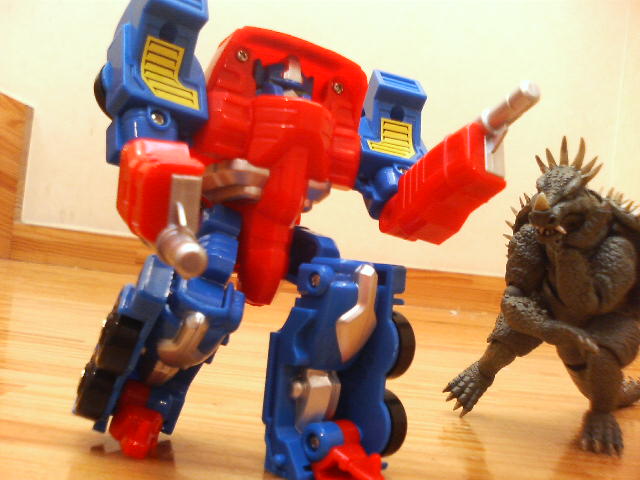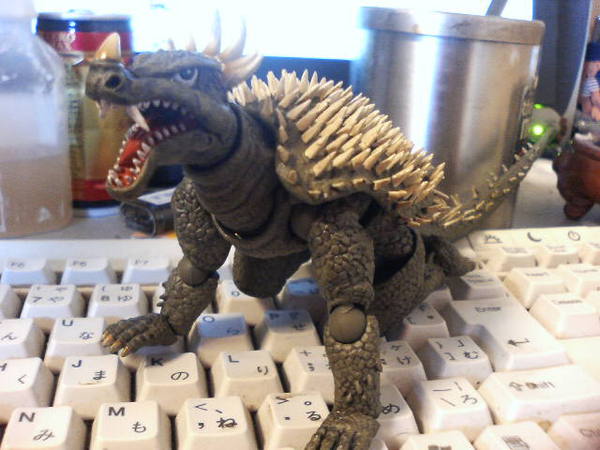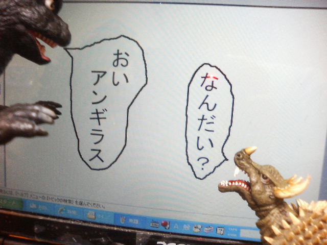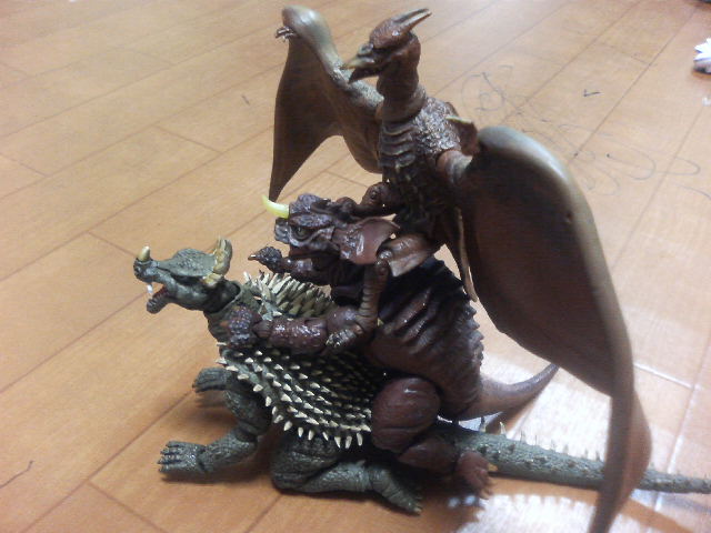 ということで『もうすぐ告知記念』で、特撮リボルテック・アンギラスを購入。 昭和30年『ゴジラの逆襲』に登場したゴジラ初の対戦怪獣。 今回のモデルはいわゆる二代目で、昭和43年『怪獣総進撃』から登場し、以後数本、ゴジラのよき相棒として、宇宙怪獣たちと激戦を繰り広げておりました。 アンキロサウルスをモチーフとしながらどこでどう間違えたのか、いたって好戦的な性格。初代はいきなりゴジラと戦いながら現れ、大阪をめちゃくちゃにしたあと、大阪城を枕に絶命しました。 怪獣同士が戦いながら登場、というのは私の知る限り『ゴジラの逆襲』だけではなかろうか。 『海や山から登場→暴れる→戦い』という図式(プロレス、もしくは歌舞伎的な展開)は37年の『キングコング対ゴジラ』から。世界初の怪獣対決映画ということでいろいろ試行錯誤されていたと思われます。 四足のアンギラスに対し、ゴジラは常に中腰で、まるでタックルを狙う寝技系格闘家のようだ。組み合うと、お互い喉元を狙い、野獣同士の殺し合いで、以降のスポーツ的な戦い方とは違い、海外の恐竜映画のようでもある。 いかん二代目だ。 荒々しい野獣のような顔から二代目はお目目がくりくり、頭が平らになって、ゴジラと同じく子ども受けしそうな顔つきに。 リボルテック、バラゴン、ラドンと。 今回ももちろん、四足から戦闘時の二足体形へのチェンジは可能で、背中のトゲは軟質素材でふんずけても安全。 尻尾がやたらと長く、一応、初代の面影を残しているのだなあ、と改めて気付かされた。 『ゴジラ対ガイガン』の吹き出しでの会話。 このあと、偵察と称して日本に上陸し、自衛隊に追い返される。 全然関係ないですが、おじいちゃんが買ってきたトランスフォーマー。 どう見てもオプティマスプライム(コンボイ)の新型だと思われる。 『うーん』と悩むアンギラス。 ビークルモードにチェンジすればアンギラスを乗せることも可能、恐竜戦車ならぬ、暴龍コンボイ! 最後にアンギラスの歌をどうぞ。