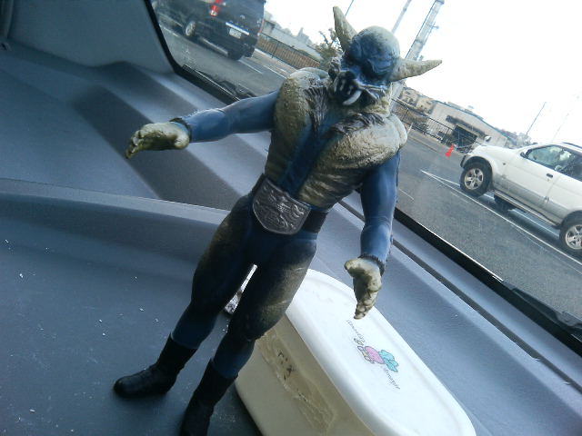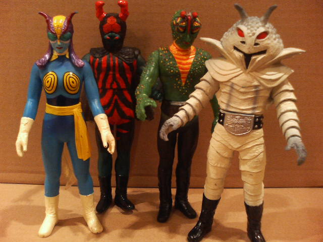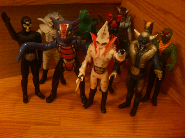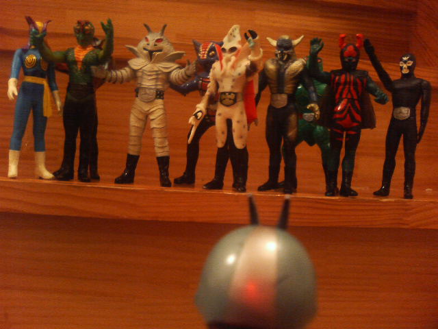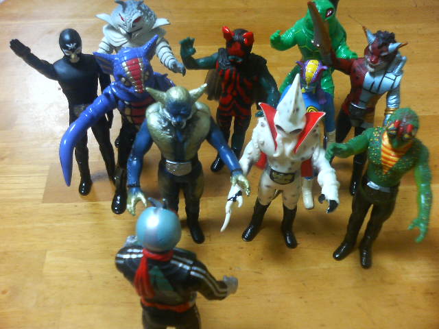 文庫サイズというのは、海の向こうではなじみがないのか新書サイズに変更。女装ものというジャンルすらも台湾では受け入れられているのか。 ◎大相撲八百長問題で、誰もテレビ格闘技もう一方の雄、プロレスと関連付けて語ろうとしないのは、日本人に残された最後の良心だからでしょうか。 先週はザンジオーを初めとするショッカー怪人4体。そして昨日は別の場所で これでバンダイ・ショッカー怪人シリーズはほぼそろった。ほぼというのは、この他、仮面ライダーXのアポロガイスト(持っていたけど、どこかにいった)と、セット売りもしくは限定で、赤戦闘員が存在する。さらにショッカーライダー1号2号も入れると……道は険しい。 怪獣も怪人もぞろりと並べると、壮観であり、心踊るものがありますな。 ライダーをいれて。 狼男一体だけで満足だったのだが、その日、別のお店で息子が『これ欲しい』と一体の怪獣を持ってきた。お父さん、怪獣は好きだが、こいつにあまり思い入れないんだ。でもインパクトが強いので買った。 これ。