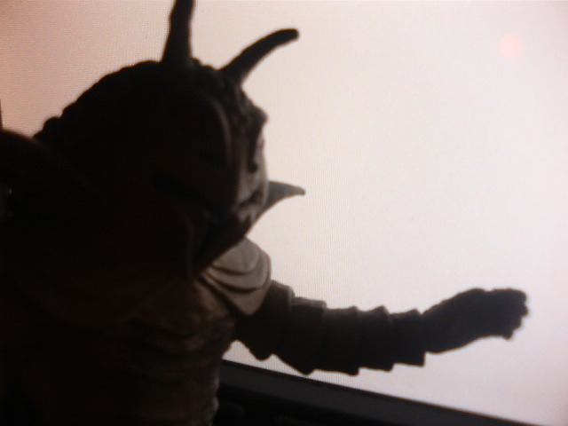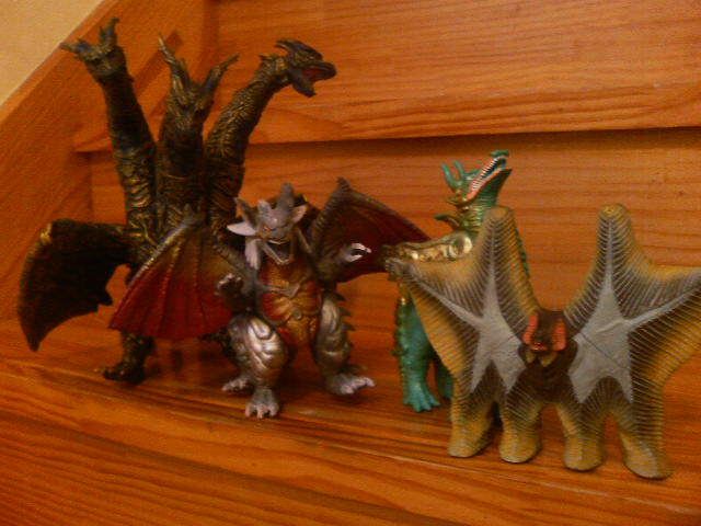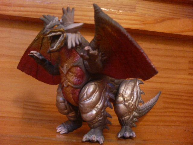 馬鹿でかいわ、四本足の上に羽根まであるは、スペックからしても黙示録の魔獣のような存在なのでしょう。そして演者が二人はいるタイプのスーツ。いわゆるドドンゴ型。 というわけで、ドドンゴ型(演者二人型)怪獣を並べてみる。 ドドンゴ、ぺスター、そしてカイザーギドラ。操作は大変だが、不自然に脚を折り曲げることなく四足のフォルムを保てるメリットがある。でも大変なので、これ以外にはあと、ジャンボキング(ウルトラマンA)とか、ストーンキング(ジャンボーグA)とか数は少ない。ぺスタータイプの怪獣もガイアにいたなあ。ガメラ2のレギオンも変則演者二人タイプだ。これで一応、ソフビへの欲求は収まり、私は再びもとの平穏な生活に戻れると思うが、自信はない。