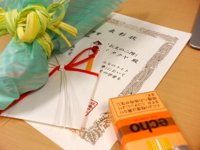 島へはこのような定期船が出ている。 島に着き、厳島神社本殿へ。今回の受賞のお礼と、滅茶苦茶にした非礼を詫びないといけない。 参道にあったコーヒーショップ。 牡蠣と鯉のぼり、それにエイリアン? 仲良くくっつく鹿たち。 しばらく歩くと五重塔が見える。 大鳥居遠景。 大鳥居! 拝観料を払って本殿へ。厳島神社に眠る三女神に『勝手なこと書いてすみませんでした、それとありがとうございます』と非礼を詫びつつ、感謝の念をささげる。あ、本殿の写真がまったくない。決して板張りでうねうねした回廊の中ではしゃいでわけではない。 石灯籠の上にあったカラスの像。 時間があればロープウェーにも乗りたかった……と未練を残しつつ、授賞式にまにあわなくなるので、宮島を離脱。 広島市内は普通に都会だなあ。原爆ドームを見たかったけれど周りに高層建築が多すぎて、ちらりとも見えない。 まだ時間があったので、近くの商店街をうろつく。いい感じにデッドストックがあるおもちゃ屋を発見したが、これというのがなく、残念。 辻ごとにおかれた灰皿。 授賞式は広島国際大学内のホールにて行われた。受付にはなんと巫女さんが二人も! 授賞式には地元マスコミや受賞者のご家族が来ていて、和やかな雰囲気で行われた。受賞コメントはグダグダでしたが。『荒唐無稽な怪(快)作』との寸評をいただく。 賞状ならびに副賞と花束。 授賞式も終わり、のんびり広島観光、と行きたかったが、そうも行かない。何せこれから5時間近くかけて帰らないといけないのだ。翌日は仕事だ! 山陽道を今度は大阪へ。休憩や食事を挟みつつ、さらには睡魔に襲われながら、何度も見えないものを引きかけたり、大阪を越えて京都に行きかけたりしながら自宅に着いたのは、もう日付が変わりかける頃だった。 『おめでとう、俺。ありがとう、俺』 中央だけじゃない、地方の人もがんばってるんだよ。都会じゃ条例がどうのこうの言ってますが、地方はオタク文化の更なる飛躍を望んでいるのです。 最後に。広島市内から山陽道へと向かう帰り道、横川駅近くでおもちゃ屋を発見。今度こそは、と思って入ってみたが、いい出物は見つからなかった。ここでも60センチバルゴンが売られていた。 翌日。地方紙に紹介されたようです。 |