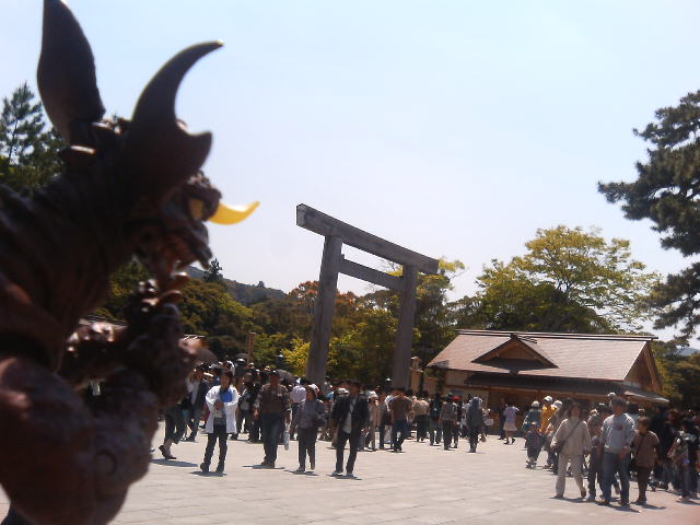 以上。本当にどうでもいいことばかりですね。 PR 前回の続き。おもちゃとかビデオ買って家に篭もってばかりもあれなので、せっかくの連休だからドライブすべえ、と三重県は伊勢神宮に参ってきました。先月の鈴鹿に続き、三重県が好きだなあ。聖地(といってもアニメの舞台になったという意味ではない)、今風に言えばパワースポットに参って更なるパワーアップを図ろうという魂胆だ。 大阪から三時間弱。 参道には、鶏や、鯉、猫それにバラゴンが放し飼いにされていました。 しかし、あいにく本宮へは長蛇の列が出来ており、子連れ狼の箱車みたいなレンタル乳母車を押すこちらとしてはとてもじゃないが無理なので、本宮のほうへ取り合えず、手を合わせて次の目的地へ。