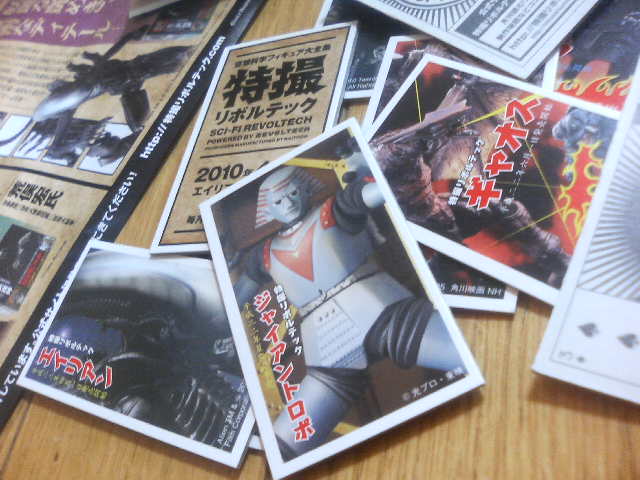 リボルテックで特撮もの、というか生き物系って考えもしなかったし、今までの経験から言えば、どうしても関節が目立って、生物らしさを損なわれることが多々あったのですな。 某社でミニ着ぐるみみたいなシリーズがありましたが、造形はよくても、なかなか自由に動けなかったりして、『フル可動の怪獣おもちゃ』なんて夢のまた夢、夢なら見ないほうがいいのさ、ソフビでも十分遊べるぜ、なんて思っておりました。 要は『見た目』をとるか、『動き』をとるかのどちらかでありました。 その点、ガンプラを起点とするロボットものの可動フィギュアはその両方を兼ね備えていて、うらやましい限りです。 人でにぎわうヨドバシの五階。短い時間でしたが、特撮リボルテックのラインナップと見本品を触ってきました。うむ、思ったより小さくない。人間が触って遊べる最低ラインだ、と思う。 見本はエイリアンと大魔神の二体。間接の球体関節をうまく隠し、それに見た目もいい! ここまでがしがし遊べる怪獣系おもちゃは今までなかったねえ、と思いつつ、パーツをぼろぼろこぼしてましたが。おぉ、これで数多あるメカ系、美少女フィギュアに肉薄できる、かも! ラインナップで一番目を引いたのはやはりバラゴン、地底怪獣バラゴン! 二足、四足、どちらにもチェンジし、耳も立ったり座ったり、こりゃすげえ! やっぱりフランケンもいるでしょ、これは! がしがし動くんなら、やっぱり戦わせないと! 惜しむらくは背中の突起の色はもっと……ぐらいなもので、コリャ即買いだな、久しぶりにおもちゃに燃えました。 ↑もらってきた面子とフライヤー。あぁ、集めるのか、俺? 修羅の道だよ。バラゴン以外だと、ガメラ、ギャオス、バットマンがほしいところ。本物より動くからなあ。