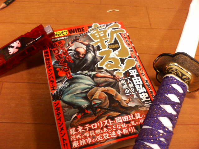 気を取り直して、近辺のショップ巡ってみるもいい出ものに巡り合えず。無理して買い物することねえんだよ、と自分を諌める。 で、タバコ買いに入ったコンビニで『斬る!』を発見、購入。 まず、平田弘史先生の漫画がコンビニに売っていること自体、すごい時代になったものだと思うが、その前に『シグルイ』と同じ原作の『駿河城御前試合』もコンビニコミック化されていたのだな。 で、『斬る!』ですが、内容は平田先生の書いた『人斬り』『座頭市』のカップリングという嬉しい構成。 もともと、愛蔵版で出ていたものをコンビニ化、いつもの流れだろうが、平田先生までとは。でもまあ、リイド社、小池書院はじめとして時代劇コミックは需要が大きいですからね。 座頭市はともかくとして、『人斬り』もかつては勝新主演で映画化されたもの。いうなれば、これは勝新コミックというわけだ。 『人斬り』は幕末の土佐藩士、岡田以蔵の生涯を描いた映画で、監督は五社英雄。バットのようにブンブン刀を振り回す勝新の殺陣が印象的でした。 DVD未発売なのが惜しまれる。 以蔵といえば、今やってる大河で仮面ライダー電王の中の人が演じているらしいですが、私はやはり、勝新のがさつで薄汚い以蔵のイメージが強いですな。 皆さんにとっての岡田以蔵はどうですか? ということで、コンビニで見かけたら、ぜひ。 『駿河城御前試合』さがさな!