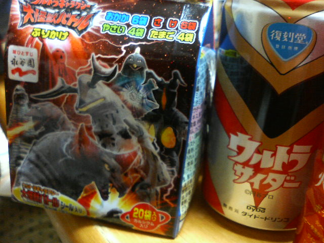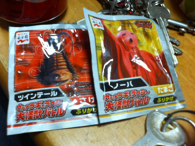 さて。 近ごろは風情がない、というか、世知辛い。 正月は元日からオープンしている店が普通だし、テレビは三が日が終わると通常営業に切り替わる。 もっと冬休みが終わるころまでだらだら映画とか漫才とか垂れ流そうよ、正月四日ぐらいまで店が開いていないゴーストタウン状態を楽しもうよ。 クリスマスだって、25日にさっさと正月準備にかかることはないでしょ。 せめて今週末ぐらいは売れ残ったシャンメリーとかおもちゃの入ったブーツ売りましょうよ。 サンタさんが来た余韻に浸りましょ、世界平和を祈りましょ。 俺のところには結局サンタは来なかったけどさ。 仕方ないので狭山のショップで500円で買った『ジャッキーブラウン』を自分へのプレゼント代わりにするものなり。 ♪110番街交差点~ 仕方ないのでクリスマス飾りを施したアギラさんをツリーに飾ってみる。 今年の総括? まだいいでしょ、振り返るようなことしてませんから、今年は。 そんな今日、マイミクさんの日記で知ったサウンドガイアメモリを求めてセブンイレブンを当たったが、メタルメモリはなかった。 これって食玩とベルトについてるガイアメモリは声とか音声パターンが違うんでしょうかね? カツオの声で叫ぶとか。 そして八尾の円谷ショップへ。 映画の合体◎◎はさておき、ブラッククリアメカザムがかなりかっこよかったのですが。 買ってきたのはウルトラサイダ―と『大怪獣バトルふりかけ』。ってどこでも買えるじゃん! いやいや、この大怪獣ふりかけ、1パックごとに絵柄が違うんですな。いろんな怪獣の風味を楽しめるのです。レッドキング味とか、ゴモラ味とか。 特にこれ! ノーバふりかけとツインテールふりかけ! どんな味だよ! ツインテールは残念ながら、エビ味ではありませんでした。 しまった、明日行けばゼロとセブンの親子が来店したというのに。 おせちもいいけど、怪獣ふりかけですよ。あぁ、世知辛い。 また怪獣の話しで終わってしまったよ。 黒田ー! (飲んでる) PR
