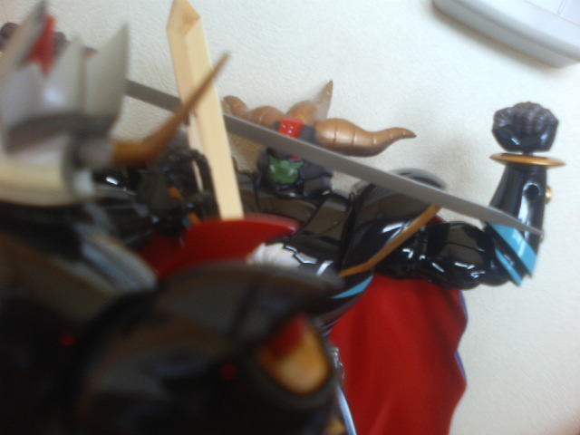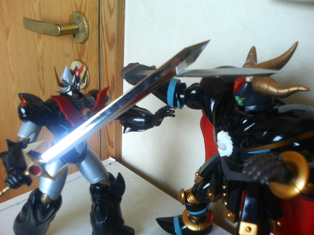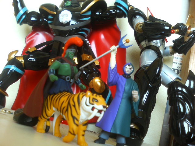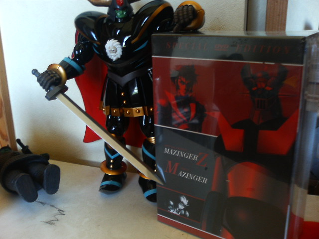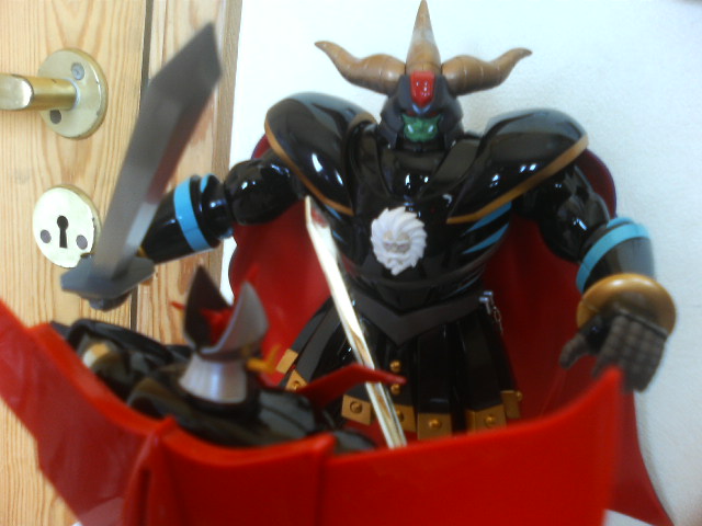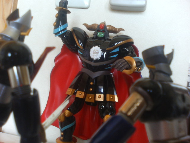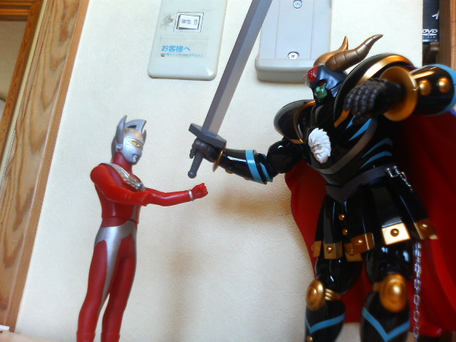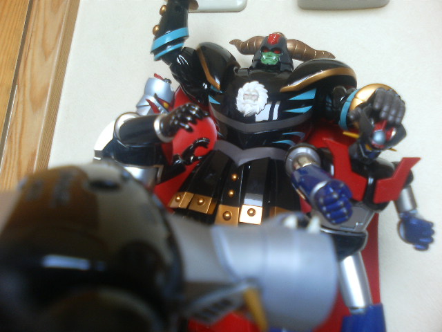 ポン友からの『あしゅらツエ―』と言うメールの意味が朝になって分かった! というわけで怒涛の『真マジンガー』第3話ですが、今川監督にしては最初に説明をちゃんと入れたり……しているけれど、ハッタリとケレン味は忘れていないようでした。 初見時大爆笑だった『Zマジンガー』第一話冒頭をアニメで再現するとは。でもお話はちょっとしか進んでおりません。来週やっとガラダとダブラスか。 ◎で、オリジナルの方はといえば……。 昨日やってきた『Z&グレート、もうこれで3年は退屈しないボックス』で、第一、二話を見るとこれまたガラダとダブラスを倒すのに時間がかかっております。妙に原作版に忠実で、兜甲児君はニ週にわたってマジンガーの操縦に四苦八苦しておりました。 物わかりのいいおじいさんとバカな孫。『真マジンガー』とは正反対のキャラ設定です。そんな甲児くんも『グレート』終盤に再登場した時はすっかり大人の雰囲気でしたが続く『グレンダイザー』で再び……。 ◎マジンガーZ1、2話を見た後は我慢できずにグレート31話の暗黒大将軍の最後を見ました。見てしまいました。 戦闘獣をことごとく倒され、総力戦とばかりに自ら戦地に赴く将軍様。 あと一歩の所までグレートを追い詰める将軍様。先にグレートが倒れ、将軍様がとどめを刺そうとしたその瞬間、半身を起したグレートのマジンガーブレードが将軍様のお腹の顔面(変な日本語)を貫通! そして再びグレートはその身を地に伏せる。 「勝った、グレートに勝った!」 勝利を確信した将軍様。援軍を送るという部下の声に『いらん、今私に必要なのは地獄の責め苦にも耐える勇者の歌声だ!』とカッコいい勝利宣言! そして、爆死……。 『進む道を誤ってしまったが、お前は立派な将軍だった』 全身から血のようなオイルを流し、片手片腕のグレートのコクピットの中、血まみれの剣鉄也が呟いて、番組は終わる。 そして次週はミケーネ帝国総出の将軍様の弔い合戦……かと思いきや 、剣鉄也のトラウマ話でした。 戦闘のプロである鉄也君は実は鳥嫌いで、カナリアを見て錯乱し、鳥型戦闘獣に手が出せませんでした。なんでも少年時代、ペットに鷹を飼っており(無茶苦茶だ!)、それが友達を襲って失明させてしまったからだそうです。 やっぱり最初っから見なおそう。 ◎で、懲りずに今日も将軍様の合金で遊んでみた。まだまだ遊べる。 えんま怪獣エンマーゴの代わりとして、ウルトラマンタロウと戦わせてみた。 五月人形の代わりに飾ってみた。ダースベイダーの五月人形があったんだから、暗黒大将軍でもいいでしょ。