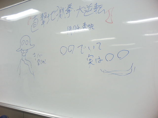 『真マジンガー 衝撃!Z編』 うわーい、楽しみだなー。 真(チェンジ!)ゲッターみたいに 『真』と書いて『パイルダーオン』と読むんだぜ、きっと。 つくづくこの人はロボが好き……、いや、エネルギーが好きな監督だなあ。日本一のエネルギー監督さ。 (シズマドライブとかゲッター線とか、バヒュームとかデビルガンダム細胞とか) 真マジンガーの情報だけでご飯三杯、こうふんしてしまい眠りこけ、すっかり忘れておりましたが……。 一昨日発売だった! ニンテンドーDS 『名探偵浅見光彦シリーズ・副都心連続殺人事件』 初のミステリー! 萌え要素一切なし! なこの作品のシナリオの大半を担当しましたので、よろしくお願いします。 去年のある日 『今度浅見光彦のゲームやるんですよ』 『へえ、サスペンス劇場の常連で一般受けしそうですね。で、誰がやるんですか?』 『お前』 『へ?で、では、誰のパートを……』 『浅見光彦パート』 『って、全部かよ!』 てな具合に始まった、夏のミステリ猛特訓。この節はいろんな人にご迷惑かけました。軽井沢、カツ丼うめー。 てな訳で、DSをお持ちでミステリ好きのあなた、是非。 俺が書いてるかと言ってくだらない下ネタやギャグはありませんが。 初期案は『浅見光彦対ツチノコ』でしたが、出来るわけない。 ◎一昨日NHKでやっていた『長髪大怪獣ゲハラ』があまりにも面白かったので、描いてみました。普通キャプチャとか載せるだろうが、あえてしない。 ◎先日の授業の様子。 みんなで『直撃地獄拳・大逆転』を見ました。食えない料理ではない。 理数系の教室かと思われる書き込み。 休み時間に生徒さんが必死になって平成ライダーの総括をやっていたのでした。 その情熱、そのガッツ、次に生かしてほしい。 PR