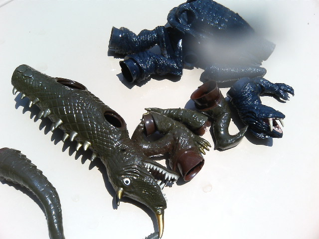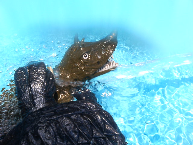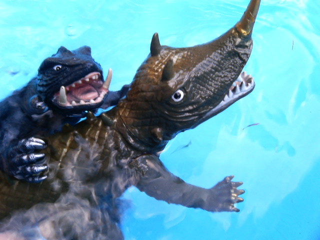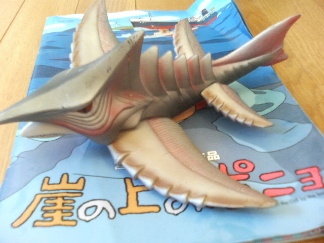 とか言いながらしがらみとか何とかで、今話題の映画の初日に行く事に相成りました。 お魚さんが陸に上がってくる映画……そう、 『崖の上のポニョ』です! ♪ポーニョポーニョポニョ魚の子~ ポニョは可愛いなあ。 あの歌が耳から離れません。その時点であの映画は勝ったのです。我々民衆に。歌の力は凄まじいということを『マクロス』シリーズで散々やっているというのに! オリジナル主題歌を前面に使わなかった『スピードレーサー』は負けなのです。 花が咲いた時点で我々の負けだったのです(ガメラ2より)。 で、ポニョですが。 なんだか最近の宮崎監督の映画は、予告の壮大さとは裏腹に別の小さな事件で物語が収束するような……、なんだか軸がぶれてるような……。 気のせい? でもまあ、ですよあの『全部手描きです!』と歌った、海やそこの生物のうにょうにょした動きは、気が狂いそうになりました。 魚嫌いは気を失いそうなぐらいに大量にそりゃもう大量にうじゃうじゃしてます! 可愛いを超えてキモイです! 汚れた海の街、目玉を睨ませながら、うにょうにょ迫る海坊主のような波と少年……。 『ゴジラ対ヘドラ』を思い出した人が必ずいるはず。 でも天下の宮崎監督はこんなものの影響をこれっぽっちも受けてないと思うのですが、観客がどう思おうと自由です。 でもポニョは可愛いです。 陸に上がったポニョはトゲトゲしてますねえ。 江もすごいし、まるで黄泉の世界に旅立つような後半の……。そう、この人の映画って決して夢と希望溢れるものばかりじゃないのです。結構グロテスクです。 そこに自分のやりたい事を凝縮しているかの如くグロいです。画で見せてる部分もあるし、心情的にそう現してる部分もある。だからなんだかんだ言ってもつい見に行きたくなるんですなあ。やるなあ、爺。 この人とスピルバーグはホント、グロいの好きですよ。 世界中のこども達に夢と希望とトラウマを与えているのですな。 それでええ、と思う。 ビニールプールを出したので『ガメラ対バルゴン』のラストを再現しました。 ソフビは水が入るとタポンタポンになるので、気をつけて遊ぶように。遊んだらちゃんとバラシて乾かす事をお勧めします。 |