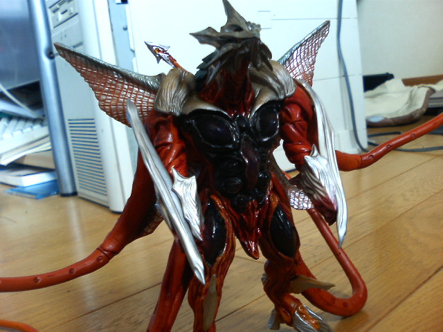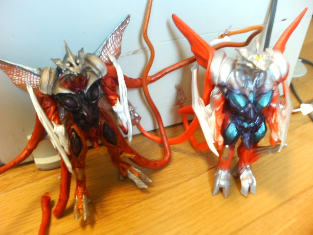 ここに来て基礎がしっかりしてない自分を呪ってみる。 ということで、気分転換に海洋堂のイリスのフィギュアを購入。いまさらかよ! 「ガメラ3邪神(イリス)覚醒」に登場。 平成三部作のトリを勤めた怪獣であります。 ギャオスの変異体という設定ながら、その容姿は似て非なるもの。 しかしながらトンガリで触手というガメラのライバルとしての要素を兼ね備えた奴です。 でも本編じゃあまり動かないよな。 おしくらまんじゅうみたいな戦いッぷりだったし。 その禍々しくも美しい容姿を十二分に発揮できたのは空中戦の時か。 さて、と箱から出してみると……。まず、触手が邪魔で立てない! 更に可動箇所をいじってみると、肩が根元から取れ、更には足裏のパーツもポロポロ取れる。 昔のフィギュアだねえ。こりゃディスプレイモデルにしかならねえし、いつどこが壊れるのか分からんからそっとしておこう。 ゲゾラみたいにガメラを触手で持ち上げてわっしょーい! ってやりたかったのに。 でもよく出来たオモチャなので、飾っておこう。 とりあえず遊んでみる。 でもパーツが取れるのがこわいので、無茶な事ができない。 ↑バンダイのイリスと並べる。不細工だが、遊ぶにはバンダイのソフビ版か。 と、もらったお金はすぐにオモチャに消える俺、作業に戻ります。