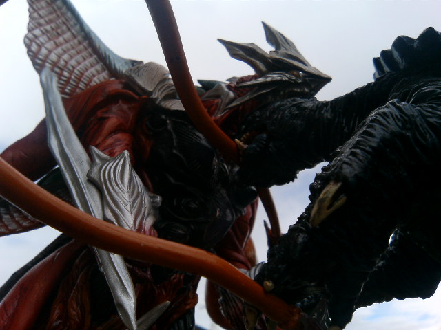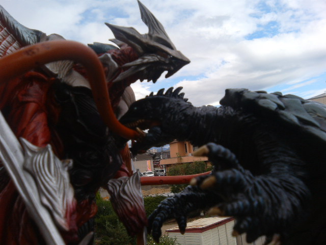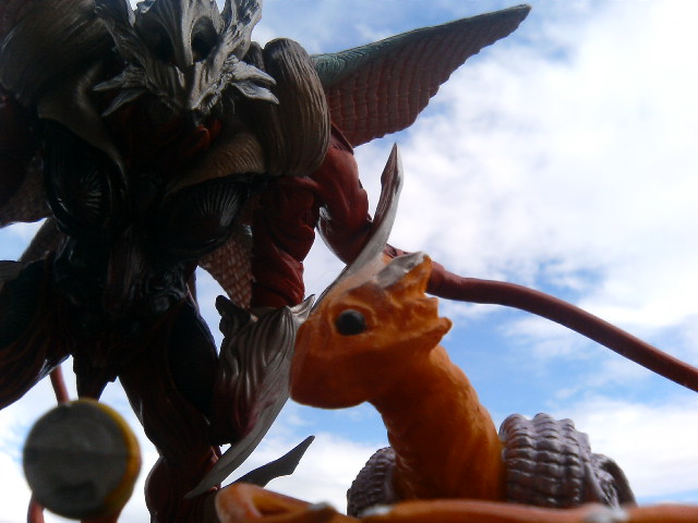 ホント、ここにきて文章の書けない体ということを思い知りましたよ。 で、作業を切り上げ、イリスで遊ぶ。 昨日の写真が逆光になっていたので、撮りなおし。 撮り直したからってどうということでもないが、気分の問題です! このパーツのぽろぽろ取れる邪神様は手足を動かさずに体当たりで遊ぶことにした! すると余計にパーツが取れる! くそう! 映画本編では京都駅構内でナイトシーンなので、こんな青空の下の戦闘はございません。いい雲だー。 手前のポケモンみたいなのはイリス幼体。 紅顔のかわいい幼獣も成長すればこんなトンガッタ奴になるんですよ。 回転式窓ガラスの上に乗せて、真下からねらってみたが、ガラスが汚かったりと色々問題あり。 ガラス越しのあおり画、ということで本人は『ジャイアントロボ』(実写)の戦闘シーンや『必殺秘中仕事屋家業』の牢内で仕置するシーンや、『必殺商売人』の狭苦しいアジトをイメージしていたのですが。 再チャレンジだ。 言い忘れてましたが、イリスは『プオー プロロロロ』と鳴きます。 PR