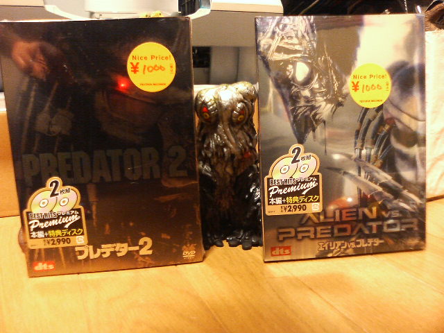こどもの日なので、俺もおもちゃを買おうかと思ったけど、ぐっとこらえたそんな日、ハルヒのフィグマをじっと見ながら頭の中ではEXゴモラト、リペイントでぐっと良くなったけど、金型修正しろよのテレスドンとか新発売のザラブ星人、ババルウ星人の事で頭がいっぱいなミドリ電化、そんな日。 そんな日なので、サーカス見物に出かけました。 サーカスといえば、『キラークラウン』とか『恐怖奇形人間』とか、あんまりいいイメージはないですな。 あと『007オクトパシー』か。 でもまあ、実際は夢あふれる大人も子供も楽しめるショーなのですよ。 手に汗握る人間業とは思えぬアクロバティックな動き! 爆笑必死のピエロ! 決して子供好きの殺人鬼ではない! かわいいワンちゃん! いや、バカにできんよ。世の中に絶望している人、たいがいの娯楽に飽きた人はどうぞ。 ライブってのがいやがおうにも盛り上げてくれますよ。 そして出てくる人が美男美女、まさに夢の舞台! おにゃのこのももとか、おなか周りがそりゃもう(こどもの日なので自粛)。 茶髪のチャイナガール? もいいなあ、とか。 帰りの渋滞さえなければ満足満足のサーカスでした。パンフ買っておけばよかった。あ、水筒テントに忘れてきた。 で、話変わって。 マイミクの誰もがみんな狩り、狩りと言っているので、流行に乗り遅れない不肖私めも狩りに参加いたしました! ↑ ツタヤで1000均一! 一作目よりもキャラが立って大出世の『プレデター2』、そしてSF界の馬場対猪木『エイリアン対プレデタ―』のアルティメットディション(おそらく。古いタイプか?)!! ウソで固めたナイフ切りつけるXメンもあったが、とにかく狩りだ! そう、狩りといえば宇宙ハンターのプレデターを置いて他にないでしょうでしょう、ご同輩~。 『AVP』は未見のまま購入に踏み切った! なぜなら、それがゴールデンウィークだからだ! 惜しむらくは宇宙人の不法滞在は許さない! の『プレデター』一作目がなかったこと! あれは廉価版じゃダメだ! アルティメットでないと吹き替えがない! そういや昔ケイブンシャの大百科で『エイリアン対物体x』ってのもあったな。 『フレディ、ジェイソン対アッシュ(*)』の企画は流れたのか? 写真は、エイリアンに先駆ける『宇宙グロモンスター』、ヘドラさんと。 あぁ、明日で連休終わり。終われ! (*)フレディ、ジェイソンは『エルム街の悪夢』『13日の金曜日』シリーズで有名になったキャラ。 アッシュは誰? はい、『死霊のはらわた1、2』『キャプテンスーパーマーケット』の主役で、片腕がチェーンソーのスーパー店員です。かなり強い。