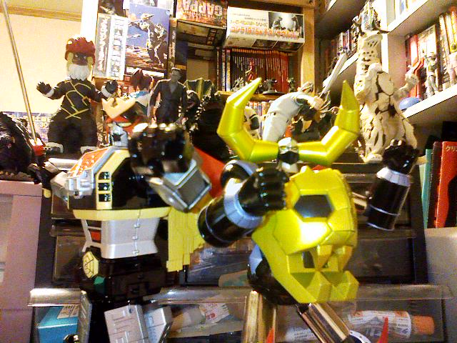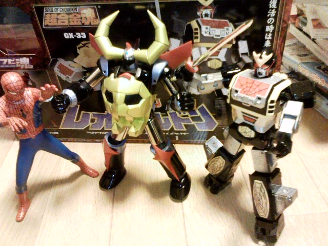 フロントとサイドにカメラが付いているのがこいつの売りなのに、それができなければ意味がないのです。 それにあのずしりと来る重量感。あいつがいない間、俺は何でその重さを手の中で補えばいいのだ、とトイザらスへ。 そう言えば、今日はワンフェス、今年も俺は行けませんが、なに、おもちゃ祭りなら一人でもできるぜ、と東の空を見ながらつぶやいた。 ザラスの熱い日、俺はレンジ品ラス一の超合金ガイキングと 叩き売りの超合金魂レオパルドンを購入! この二つ合わせてもゴーオンジャーのロボより安いとは! でも合金二個買いは心臓がバクバクしました。 ガイキングは展示品を持ってくるということでしばらく待たされたが、結局店員が箱詰めが分からず、下半身をぶらぶらさせながら持ってきたので、俺が箱詰めするはめに。 しかし、合体させてみると、腕を動かすたびにパンチが飛んでいく。 これが、超合金の限界なのか? でも見た事ない武器満載なので良しとしよう。これってガイキングザグレートに……、ならないか。 レオパルドンは『版権取ってるうちにやってまえ!』な感じで、ソフビ魂スパイダーマンやら、ミニカーサイズのスパイダーマシンがついていて、お得な逸品。着ぐるみロボ特有の『ここまでしか動かせません』な可動も嘘っぽくなくていい。 そうそう、サム・ライミ版ではオミットされてるけど、スパイダーマンって巨大ロボに乗ったり、登場時に『復讐の男、スパイダーマン!』とか『キノコ狩りの男、スパイダーマン!』って名乗るんだぜ。 ダイナミック系の超合金はいらない、とか言ってたくせにこのざまだ。でも面白いからいいのだよ。 果てしなーく続くー地獄のー足音ー♪ カップ酒をなめつつ、独り、おもちゃ祭りでした。