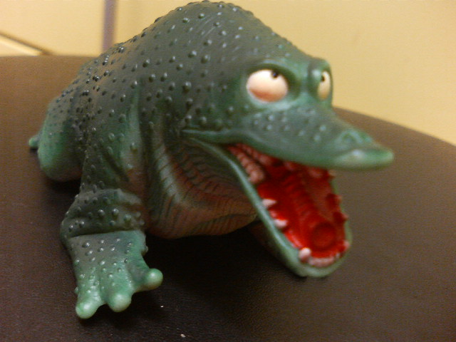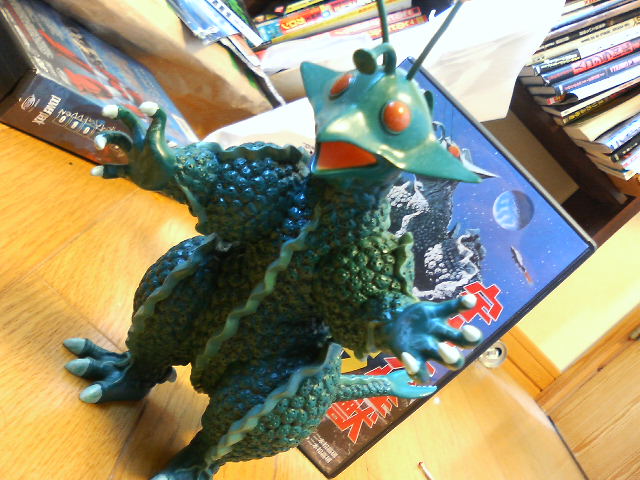 作業と夜勤と家事の繰り返しの毎日も定着してきました。キッチンを磨くのは得意です。 好きなあの子、たとえば美少女フィギュアとかですと、好きだったら、同じポーズ、同じカラーリングでも2個、3個と欲しくなりませんか? それが格安で売られていたら、まるで奴隷市場を見ている気分になって思わず保護しちゃうとか……。 ↑で、二体目のバラゴン平成版。昭和版も好きだが、こいつも愛くるしい。 こんな物二つもそろえてどうなるのか? と言われると 『楽しいから』と答えておこう。 小さいガマクジラソフビも、いい顔をしている。真珠を吸い込むベロもちゃんとモールドされている。 ↑ ヤフオクで気になっていたが、買い逃した逸品。画像でも十分か。 当時物のマジンガーZカバン。Zの顔が原作版、甲児君のスーツが初期設定で、マフラーまいてるなど、なかなかにマニアック。パイルダーも白いし。 当時はそんなこと全然考えてなかったんだろうけど、今やったら、苦情ものかも。 嗚呼、でもいいなあ、これ。って手元に置いても実用性0ですけど。 昨日、寝ていなければ……。 プロット! プロット! 書き方忘れた! そして一番の泣き所、『ドラゴン危機一髪』試写会の盛り上がり! あぁ、俺は今、どの辺だろう。 宇宙大怪獣ギララ復活! で、ギララとは何ぞや? という若い諸兄に、若い俺が説明すると、映画会社松竹が唯一制作した怪獣映画である! 終わり。 円盤状の頭部、それっぽい触覚、全身を覆ういぼいぼ……、なるほど宇宙怪獣、と頷かせるグッドデザインだ! それじゃあ、同期の日活怪獣ガッパは北京五輪に親子で見物でもしますかね。
