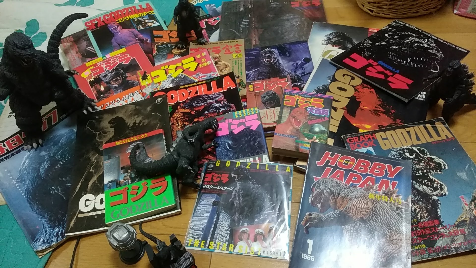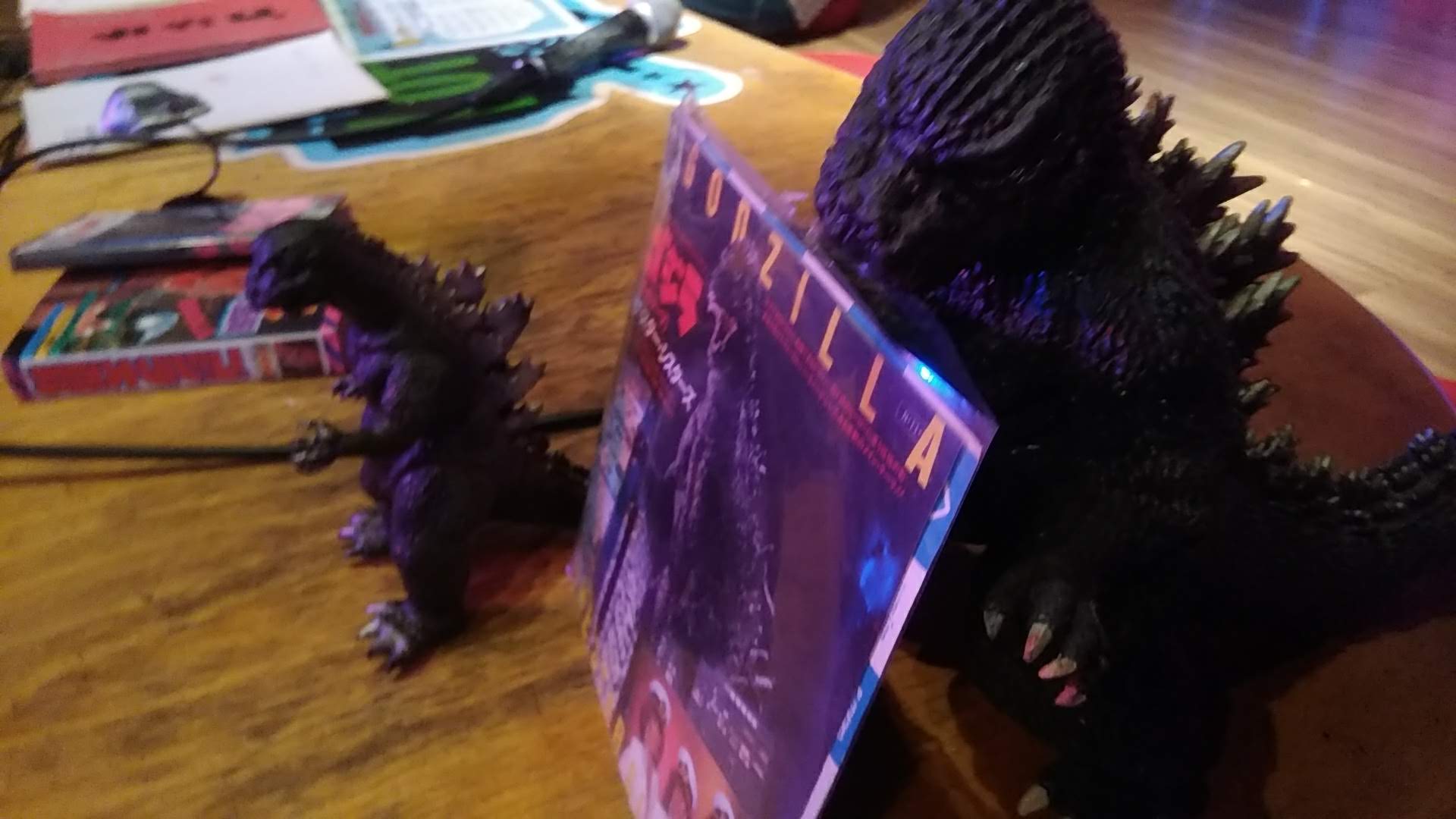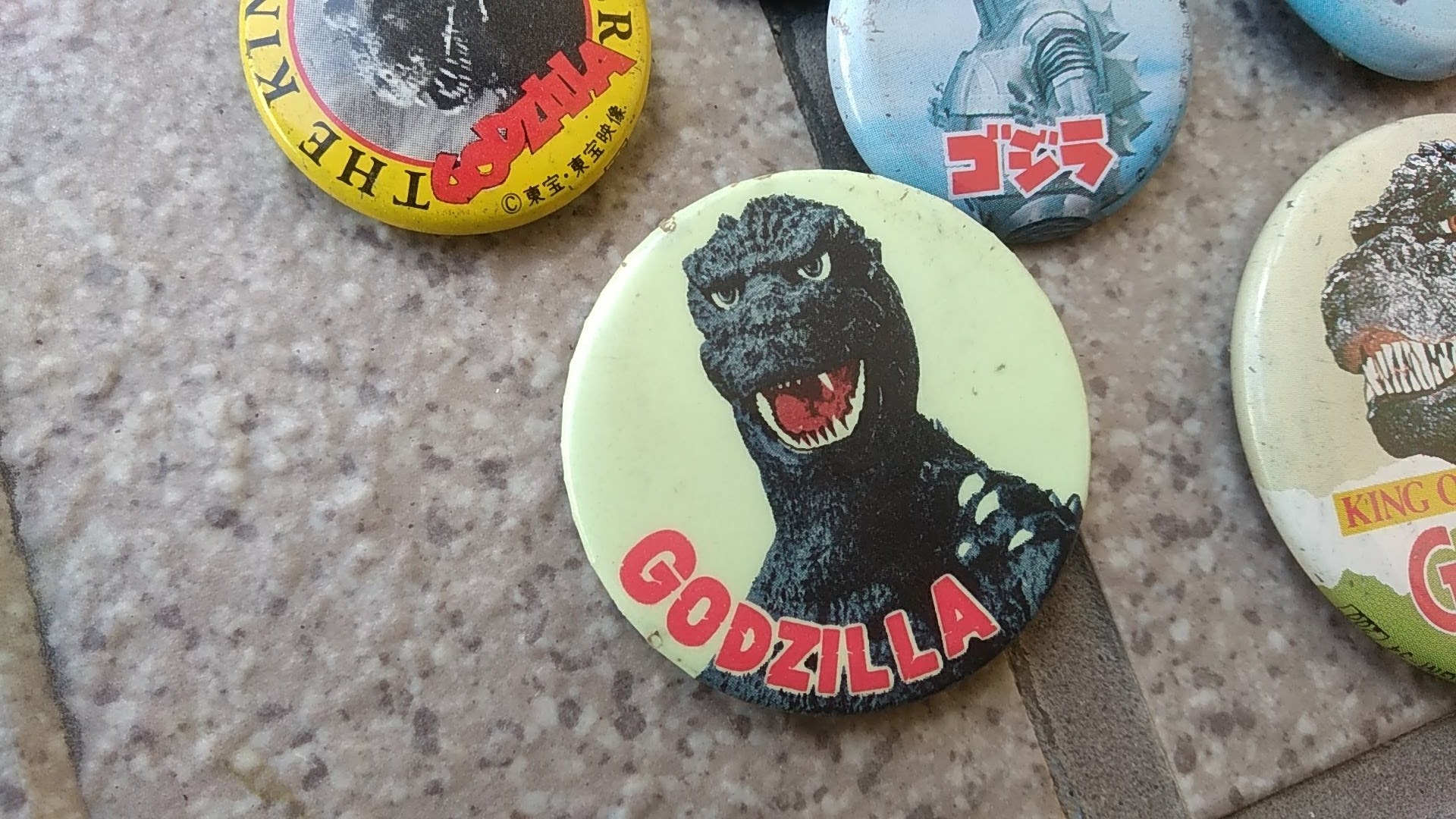 とりあえず形から入るほうなので、家にある84ゴジラグッズをかき集める。物置を漁りに漁って、前売り特典の光るゴジラバッジも発見!