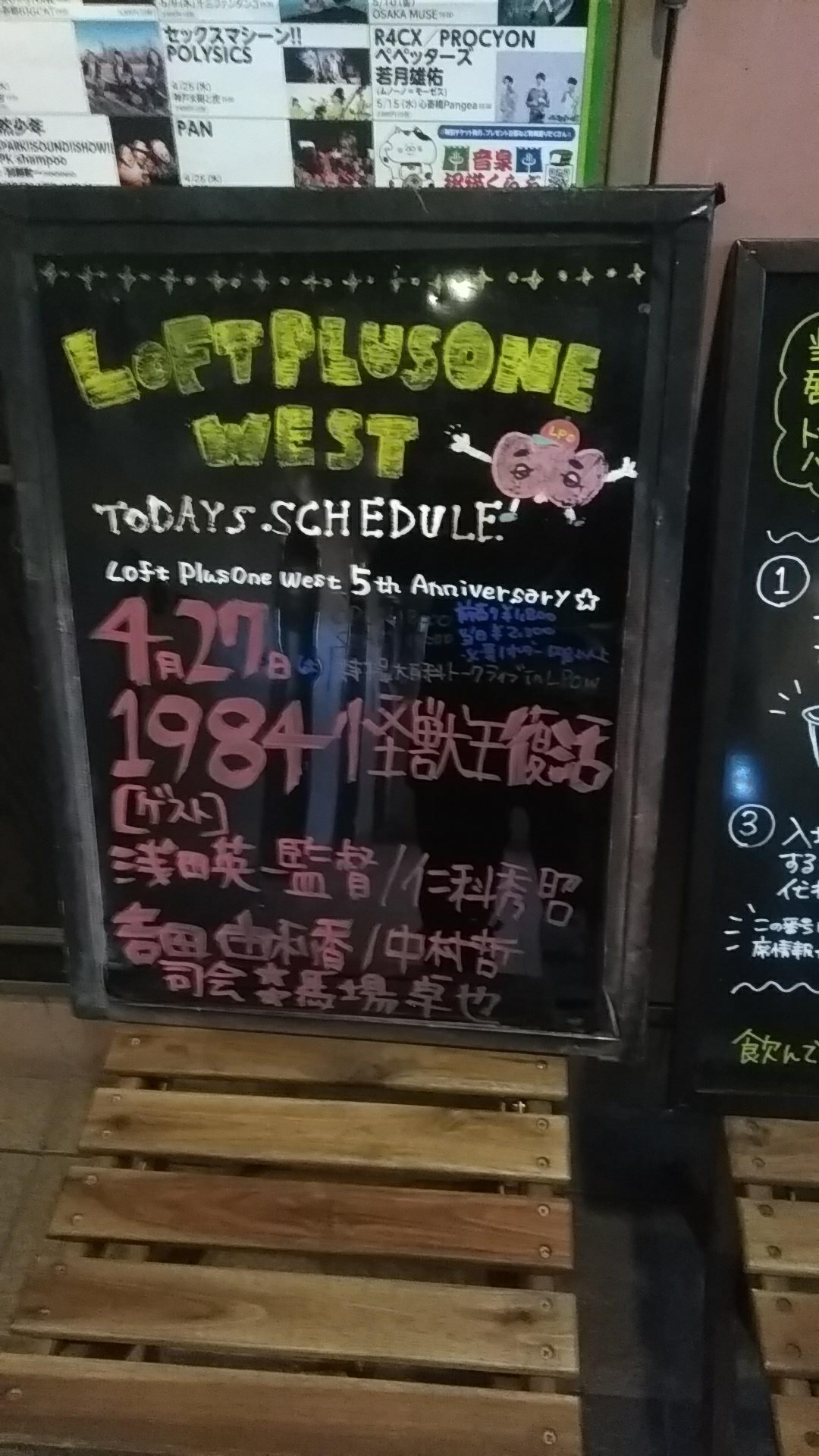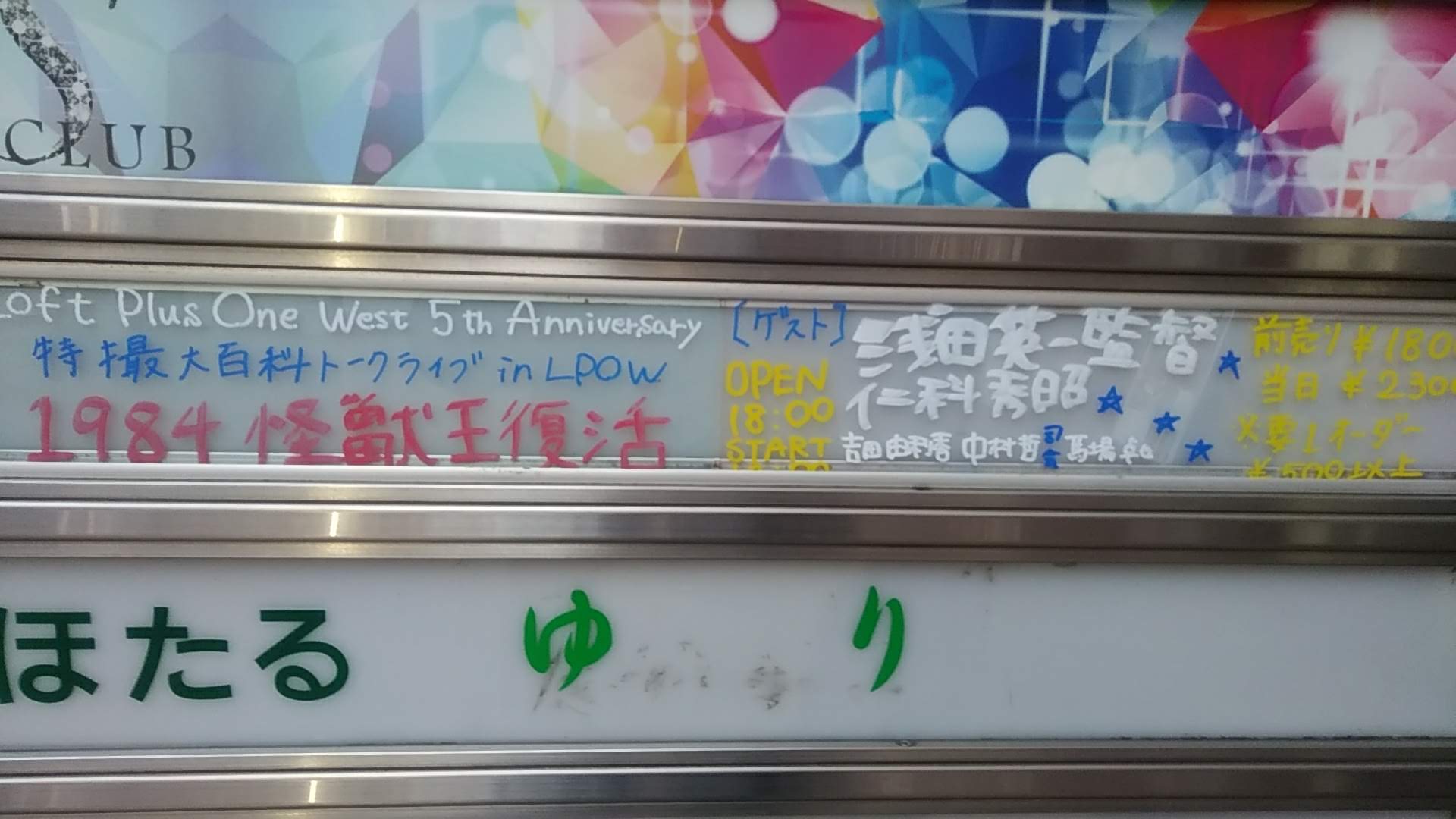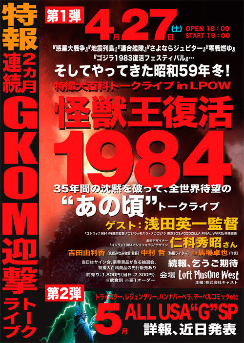 今回はそんな連休初日のお話。一週間近く前のことである。場所は大阪は宗衛門町、ロフトプラスワンウエストである。今までも特撮大百科のキャスト主催、京都みなみ会館協賛で数々のイベントが行われてきた場所である。今回のテーマは『ゴジラ(1984)』! 当時の助監督だった浅田英一氏、ショッキラスデザインの美術担当仁科秀昭氏、それにみなみ会館の吉田由利香館長、中村哲キャスト社長を迎えてのトークイベント。