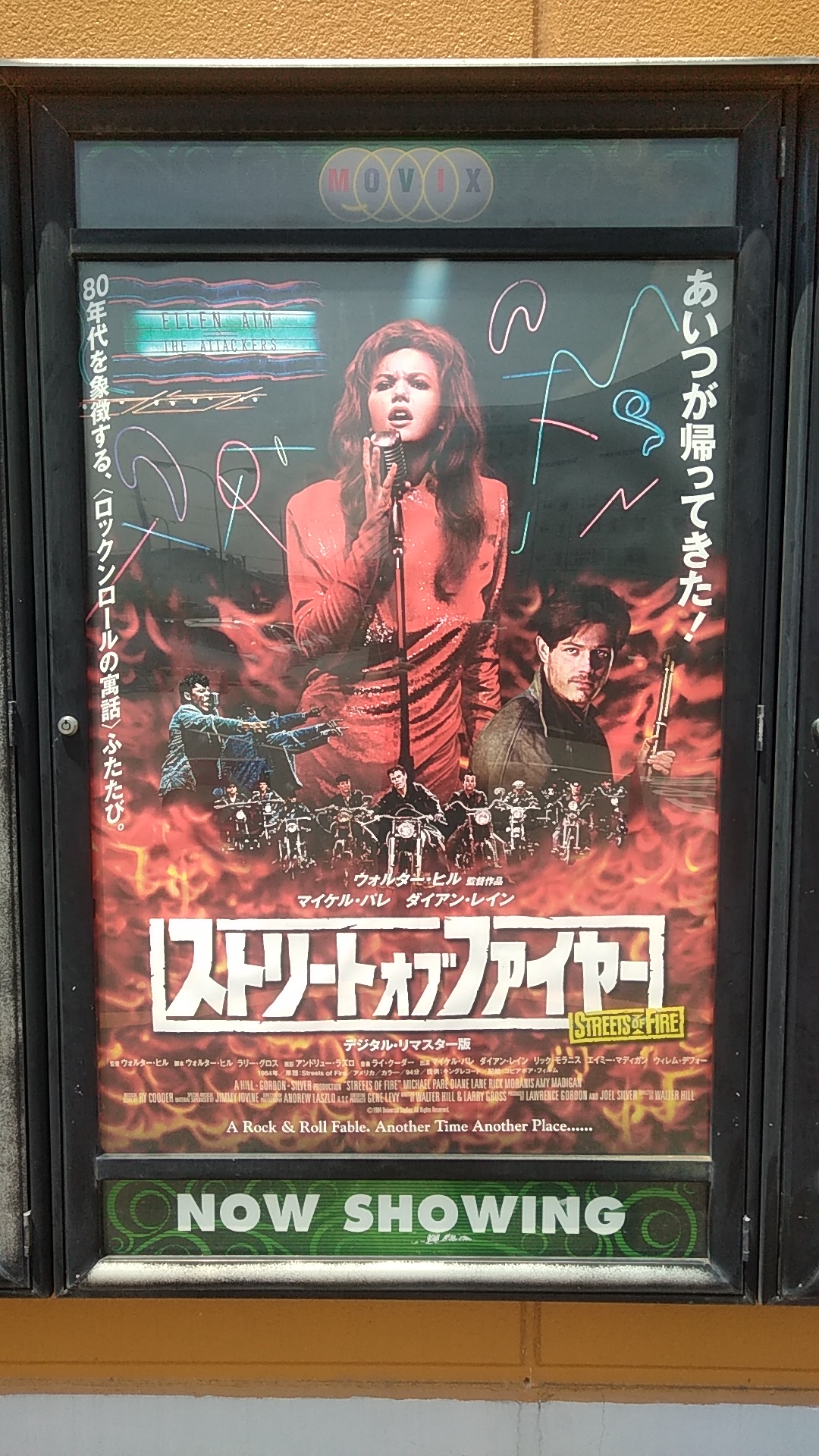 そして一方の介護の仕事柄、平日に休みになることが多く、その日も職場で、明日は何しようかと思案していた。こんな暑い日は泳ぎに行くか、映画で見るに限る。しかし自分には『子供縛り』というルールがあって、子供が見たいといってる映画を一人で見ないことにしている。子供と時間を合わせて見に行くことを前提にしているのですが、結構一人で行ったりして、一人でルールを破っております。恐竜映画は先日行ったし、スターウォーズの新作は子供と行く約束をしてるので後回しにしよう。となると、見たい映画がない。ないこともないけど、近所で見たいのがない。困ったな……と思ったらMOVIX堺で『ストリートオブファイヤー』上映とあり、一瞬『え?』となった。