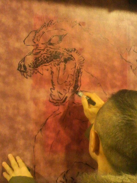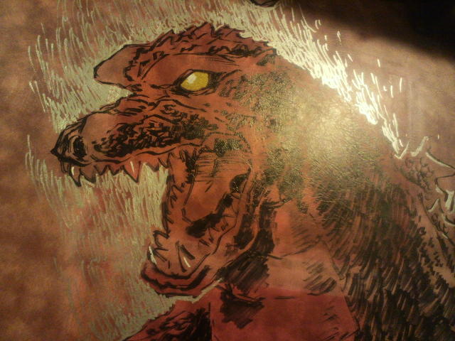 ゴジラ、そして機龍! 上映中に行われる、ライブドローイング! 描いてる様子は誰も見ることができない! すごい、みるみるゴジラと機龍が出来上がっていく!