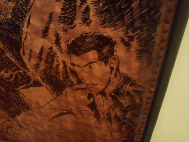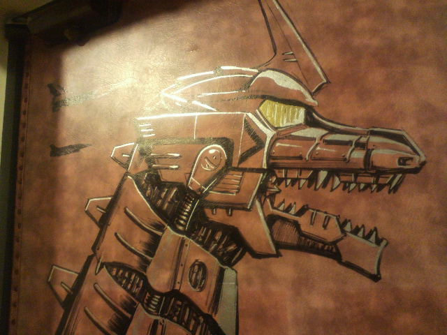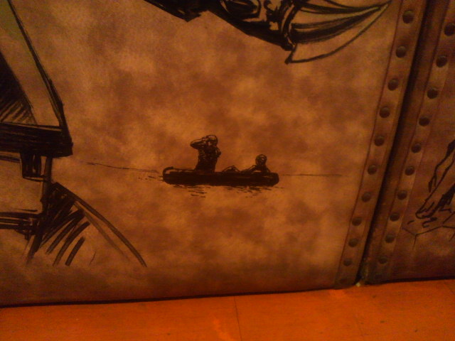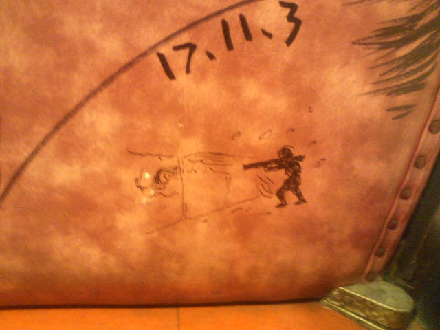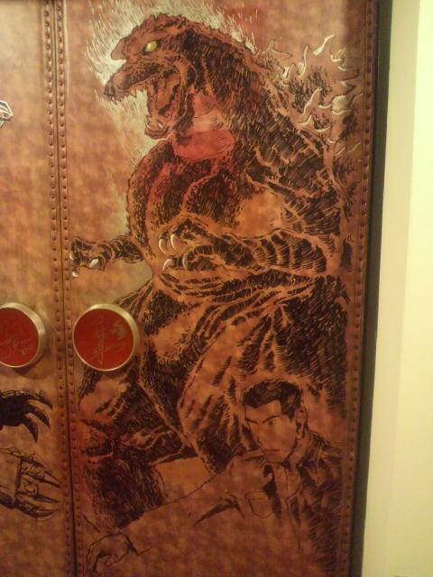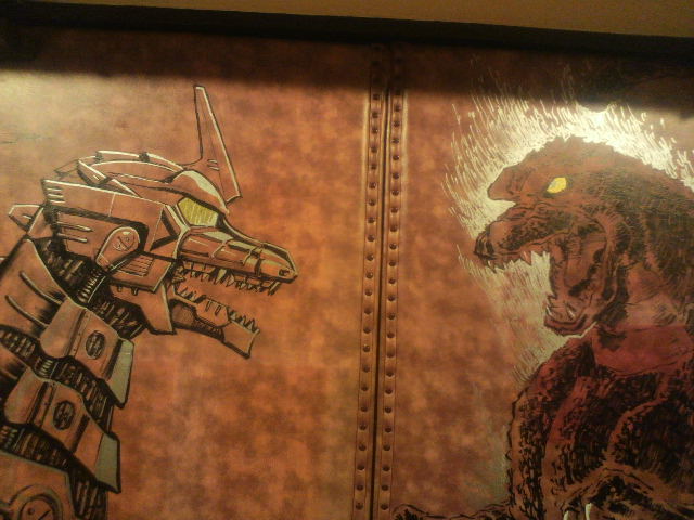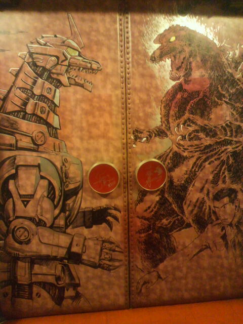 続いては『ゴジラ×メカゴジラ』。その間、西川、坂井両氏による修正、というか付け足し作業がちょこちょこと。坂井先生が権藤一佐を描けば、西川先生は『東京SOS』の機龍隊ゴムボートといった感じ。みなみ会館の扉がどんどんすごいことになっていく!