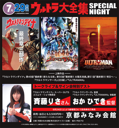 と、こんなことを書くとまるで終わってしまったかのように思われますが、もうちょっとだけ続くのです。なら書くな。いや、覚えている間に書いておこう。9月のウルトラマンAイベントから始まり、いよいよ来月でラスト。そして先日はアベユーイチ監督の興奮冷めやらぬまま、ウルトラ大全集初のオールナイトイベント『ウルトラ大全集special night』へ。 ゲストは『ウルトラマンダイナ』ユミムラ・リョウ隊員役の斎藤りささんに『ウルトラマンサーガ』のおかひでき監督。おか監督とはその前日ババジラジオのゲストにも来ていただき、ウルトラ以外の怪獣話で大いに語っていただきました。