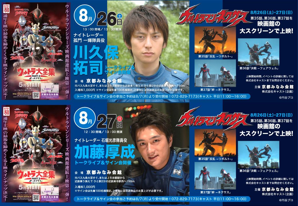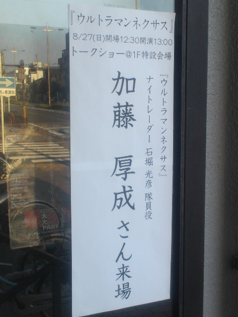 もうトランスフォーマーが出ていれば何やってもいい、みたいな感じで冒頭のアーサー王とかクライマックスとか、ベイ監督は合戦、戦争映画やりたかったんじゃないの?と思ってしまう。 日本のヒーローものを見ているものからすれば、闇落ちしてからのオプティマスの再登場が長いのと、正気に戻るまでが短かったな、とかメガトロンが人間を脅して解放させた凶悪なディセプティコンたちの扱いが雑だった、この映画にはそういうこと言うのも野暮なんですね。 前作から引き続き登場のダイノボットや、腕のあるメカキングギドラとか、怪獣ロボが出ると嬉しくなります。というか、そこしか覚えてないかも。 この映画最大のよかったところはあれだけCGバカバカやって、火薬ドッカンドッカンやって2時間半越えだからさぞかしエンドクレジットが長いんだろうな、と思ったら、あっさり終わったところ。空気の読める男だ、ベイ監督。 という事で、次回はDCとマーベルのヒーロー映画を見たいな、と思うのでした。 PR しかも今回でウルトラ大全集はいったん終了。ラストにふさわしく、両日ともにゲスト登場。今回は『ウルトラマンネクサス』より主演の川久保拓司さん、そして加藤厚成さんという豪華な顔ぶれ。 まずは初日の川久保拓司さん。本編では恋人が死んだり、副隊長にどつかれたり、変身できなかったりと、かわいそうな立場の孤門隊員でしたが、お会いすると10年近い年月を感じさせない好青年でした。 今回はさらに3月のコスモスに続き、プロデューサーの渋谷氏、ダブル司会として東京より円山氏に、ラインナップ制作の志田氏も来られ、皆様のサポートもあり、何とかやり切れました。川久保氏の溢れるネクサ愛、それに反応する、会場を埋め尽くすネクサス世代のファン(ひょっとしたら過去最高?)たち。最終回のセリフ『あきらめるな!』でトーク終了、サイン会へ。ここでも川久保氏は両手でがっちりファンの手を握手。『ウルトラマンネクサス』は大河ドラマ的な流れとホラー要素が入った演出で異色作と言われてますが、異色作ゆえにファンも多く、その絆は固いのだと、実感しました。しかし『ペドレオン』って単語がよく飛び交うイベントでした。 翌日、ウルトラ大全集のトリを務めるのは加藤厚成さん。『ウルトラマンネクサス』の防衛チーム、ナイトレイダー内でも最も目立たない隊員でしたが、その正体は全ての悪の根源、ダークザギだったという意表を突く展開で、忘れように忘れられない存在。 今回も円山氏に渋谷氏が入ってのトークになりました。が、打ち合わせの最中から『来るって』という声がちらほら。え、誰が来るの? 劇中で松永管理官を演じた堀内正美さんが神戸から来る? そんなバカな……来た、松永管理官だ! という事で、トーク本番では加藤さんのムチャぶりでサプライズ登場。これは本当に当日急きょ決まったことなので、お客様も大喜び。加藤氏の『復活の時だぁ!』から始まったトークも無事終了。 凶悪なザギとは正反対な加藤様の紳士的なサイン会に昨日に続いてファンも大満足。しかも、その後の上映会では堀内氏を含めた3人も一緒に鑑賞。最終回は加藤氏のセリフのたびに拍手が巻き起こる『ダークザギ応援上映会』になったとか。 上映終了後、ゲストの皆様は控室へ、お疲れさまでした。と、そこで加藤氏の『今みんな帰ってるの? じゃあ……』という発案で急きょハイタッチお見送り会をすることに。最後までファンサービス旺盛な加藤氏に、ファンは驚かされっぱなしだったのではないでしょうか。途中からでしたが、一人一人に『ネクサス!』とハイタッチ。そしてゲスト3人は遅れてやってきた脚本家長谷川圭一氏と共にみなみ会館を後にするのでした。ウルトラの奇跡、絆の力が最後の最後に巻き起こったネクサス祭り! 両日販売されていた『ULTRAMAN』のザ・ワンの精巧な塗装済みキット。でけえ! 思えば、プレイベントであるウルトラマンA上映会から一年。慣れない司会ぶりにもたつきつつ、一向に向上しないまま終わってしまいました。正直、会話が飛んだりする事もありましたし、ファンが聞きたい事を聞けなかったりすることもあったかと思います。それでも何とかやり通すことができたのは主催のキャスト社の皆様と、こんな拙い司会を我慢して聞いてくださったお客様、そしてウルトラの星のゲストの皆様のおかげだと思っています。この場を借りて感謝したいと思います、ありがとうございました。それにしてもうちの軽自動車にはいろんなゲストの人が乗ったものだ。