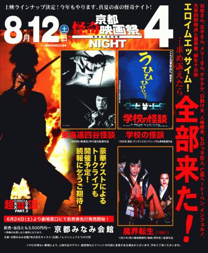 最後に名古屋駅の巨大ワンダーウーマンを拝んで帰路に着く。帰りは渋滞もなく、かなりスムーズだった。子供らも大きくなってきたので、今回みたいな旅行はこれで最後かもしれない。ぎりぎりまで予算切り詰めたけど、楽しい旅だった。しまった、自分のお土産買ってない! 毎回、古今の怪奇映画を上映するこのイベント、今回は『学校の怪談』『東海道四谷怪談』『魔界転生』の3本+α。個人的にはフェイバリット時代劇『魔界転生』が入ってるのが嬉しい限り。いつものうろ覚え新聞も魔界転生率を多めに書いてしまった。