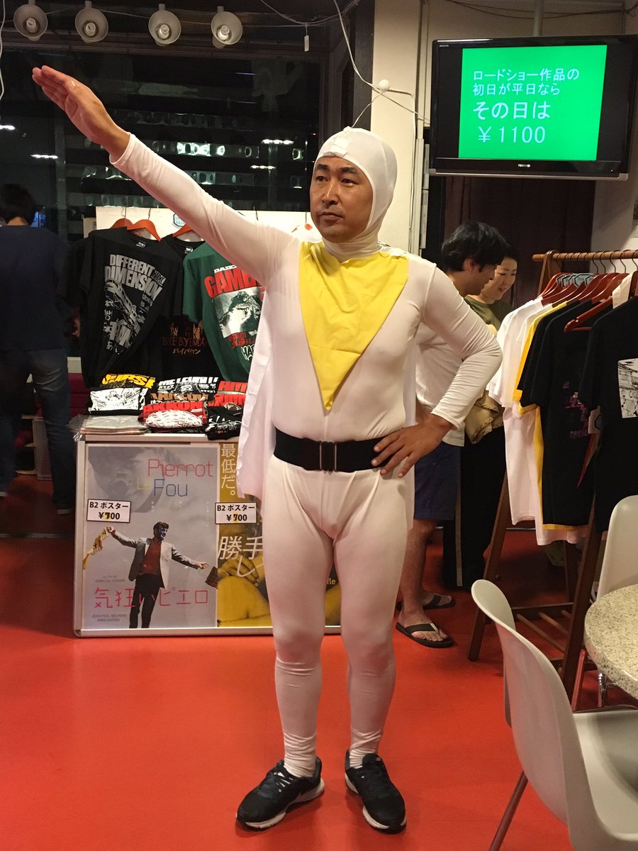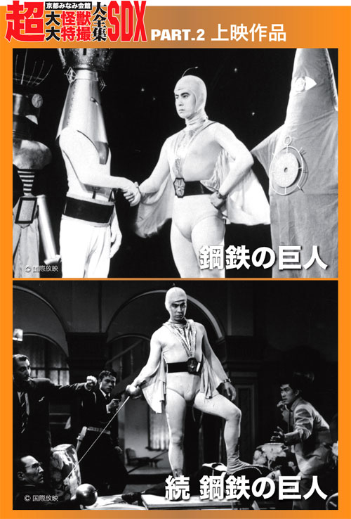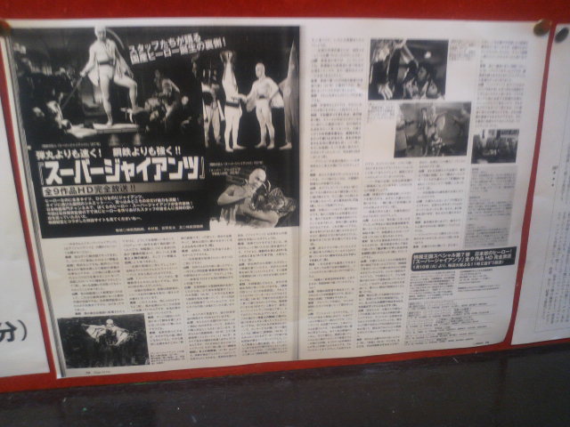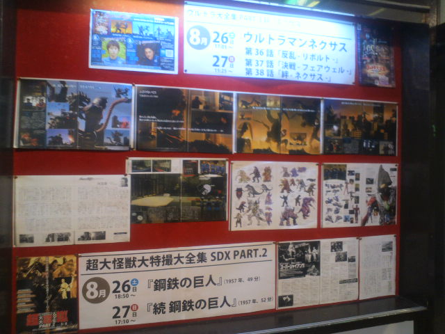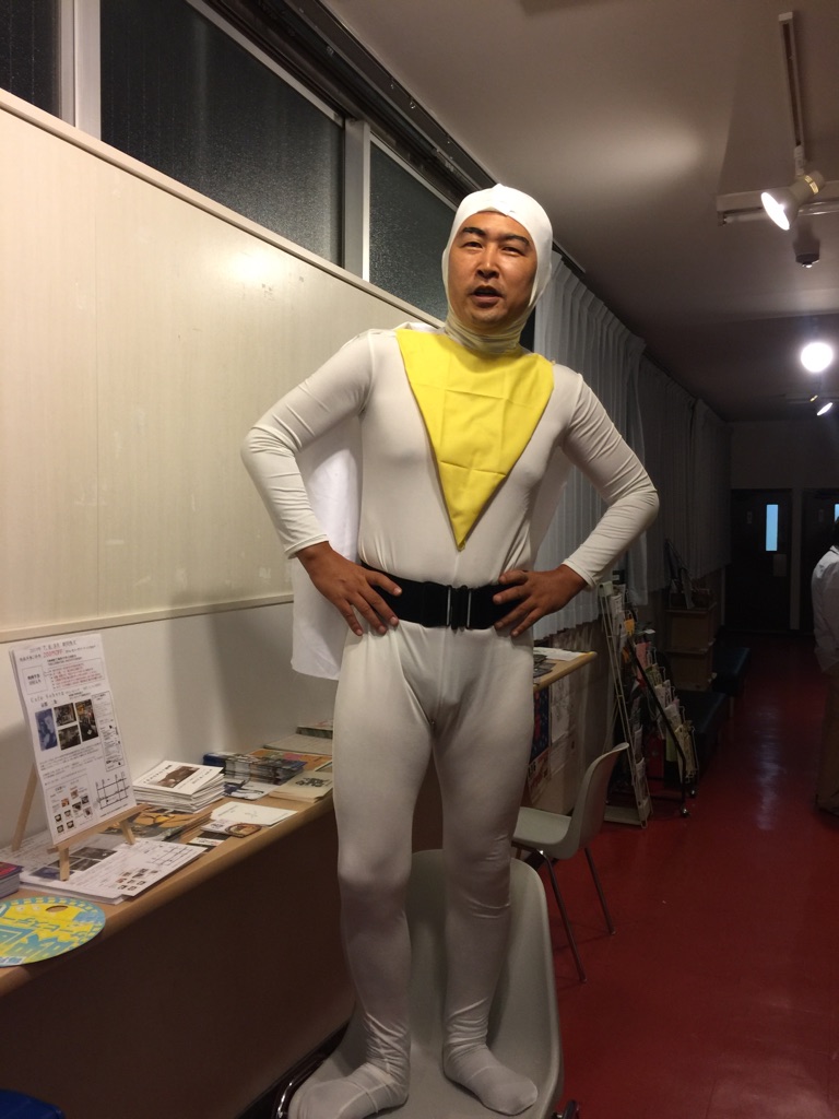 なんだかぽかんと胸に穴が開いたような感じ。でもまだウルトラの絆は途絶えない。不定期的でもこのようなイベントは続くかもしれませんし、再開すればいいなあ、と思っています。そして10月には早速快獣ブースカのイベントが……。その時、またアウアウな司会をしているのかどうか。その時は優しく見守ってください。 と、ここで終われない。ウルトラ大全集と共に行われているこれまた恒例の超SDX。今月は『鋼鉄の巨人』『続鋼鉄の巨人』という、新東宝が生んだ日本初の宇宙ヒーロー、スーパージャイアンツが上映。 あの全身タイツでモッコリな宇津井健の映画です。こんな変化球が飛んでくるのも超SDXならでは。デビュー間もない石井輝男監督のアクション演出に、後に大量のヒーロー楽曲を作りあげる渡辺宙明氏が初めて手掛けるヒーロー音楽と、見どころ、聞きどころも多い作品。それはいいとして、これがラインナップに入った時から『やる?』という宇宙(寝屋川方面)からの声を聞いた。『やるの、本当に?』『やるんだったら、やるよ?』という宇宙(寝屋川方面)からのメッセージ。作家としても大成せず、私生活がうまくいっていない自分にはいつしか羞恥心というものがごっそり抜け落ちていた。心は昔死んだ、微笑みには会ったこともない、昨日なんか知らない。『やるスよ』という返事しかない。それでお客様が和んでくれればいい、それだけでいいのさ、俺は、俺は……。 時間は少し戻って、『ネクサス』イベント初日。川久保さんのアテントの最中にポン、と渡された段ボール箱。箱には自分の名前が入っている。『そうか、これは一年間の司会を労ってくれたプレゼントか何かかな』と、とぼけたことを考えていた。箱を開けて、すべてを思い出していた。そうだ、ネクサスのことで頭がいっぱいだったけど、これを忘れていた! やるべし! しかし、まだ未完成で、今回は見送ろうという事になった。だったら、明日の上映にでも間に合わせましょう。できる限りで、ダメもとで。そんなことを言いながら、川久保さんトークショーが大盛り上がりで終了。そして上映会の最中、怒涛のようなネクサスのクライマックス、光と闇の戦いにお客様がハラハラ、ウルウルしているその外で、俺も戦っていた『やるべきか、やらざるべきか……』。その瞬間、脳裏によみがえる『あきらめるな!』の言葉。