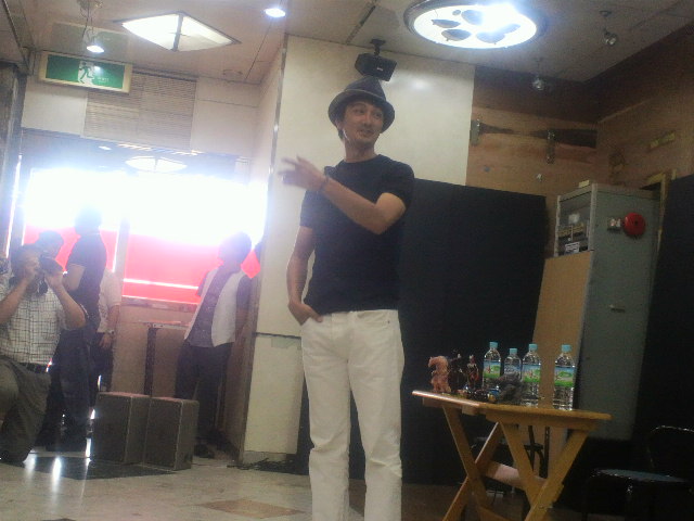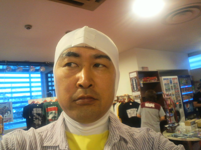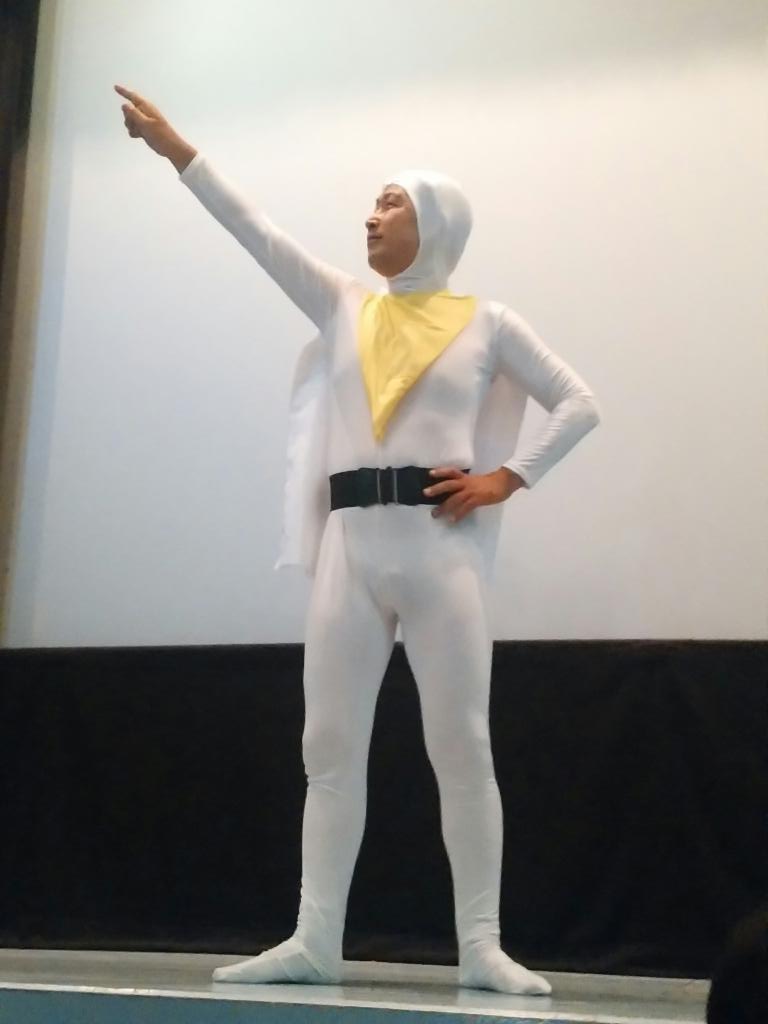 そして翌日。一回着て満足というわけにはいかない。二日目からのお客様もいるのだ。しかし、ネクサスゲストがたくさんいる中で、どこで変身すればいいんだ? とりあえず大盛り上がりのダークザギ応援上映のさなかにさっと着替え、上から洋服を着る。そしてそのまま上映終了後のゲストアテントへ。だから最後の加藤氏ハイタッチお見送り会の時にはすでにあの姿だったのです。そしてネクサス上映終了後、ゲストの皆様にご挨拶に伺った際も、そこでいろいろお話を聞いているときも洋服の下はぴっちり白タイツ。だから、なぜこの男は急に着替えているのか、なぜ突然眉が太くなったのか、そのフードっぽいものについたアンテナは何だ? と訝しがられたかもしれません。ゲストも大事、お客様も大事なのです。