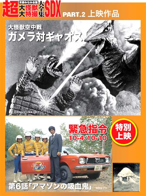 そして『ガメラ対ギャオス』、その前に『緊急指令10-4・10-10/アマゾンの吸血鬼』を16ミリで上映。なぜこれなのか? ギャオスと同じく吸血怪獣が出てくるから。『怪奇大作戦』の対象年齢をぐっと下げて当時流行していたCB無線を絡ませた『10-4・10-10』だが、全体に牧歌的なムードが漂う。恐ろしい事件が起こっているのにどこかのどかな感じ。アマゾン土産のお面に付着していた生物が人間の血を吸って湖で巨大化……。電波特捜隊にとって脅威だったのは、危険なのに湖でダイビングを敢行したがる連中だったりする。16ミリはとても状態がよく、きれいでした。