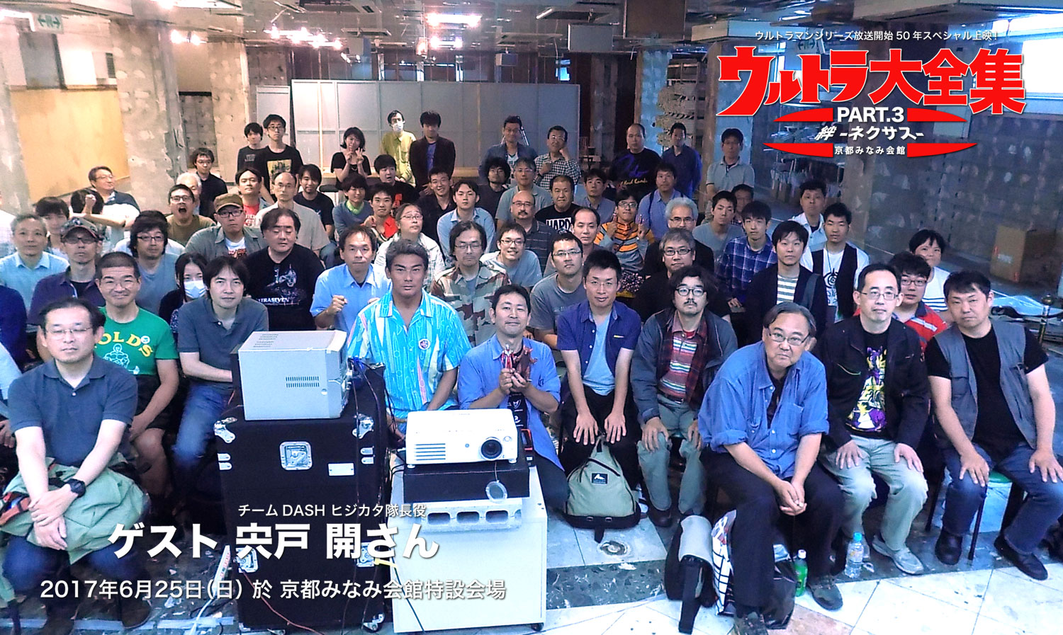 そして翌日も京都。恒例ウルトラ大全集のトークショー司会です。今回のゲストはヒジカタ隊長こと宍戸開さん。一体どんな人だろう、うまくお話しできるかな、というのはいつも思うことで、会ってみればみんないい人ばかりでした。今回の宍戸さんもとてもお話上手で、本番ぎりぎりまで映画の話で盛り上がってしまいました。トークショーもウルトラ愛に溢れる内容、お客様も満足していただけたかと思います。ちなみに宍戸さんの好きなウルトラマンは『アストラ』とのこと。持ち出し厳禁がトークの鉄則ですが、あまりにも意外かつ面白かったので、これは例外とさせていただきました。