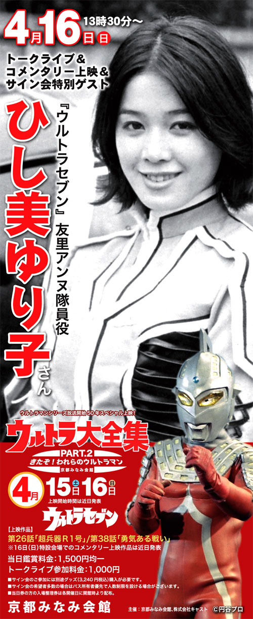 そして、日曜日。恒例『ウルトラ大全集』のトークゲストはひし美ゆり子さん。そうあ、あのアンヌ隊員! 放送50周年、いまだに根強い人気を誇るウルトラセブン、その人気をけん引していたといっても過言ではない、ウルトラヒロイン、いや古今東西のSF作品をひっくるめてもベストではないか、と言われてる永遠のヒロイン、アンヌ隊員。そんな方のトークの司会! 高まるプレッシャー、資料の準備、セブンのおさらい……果たして自分に務まるのか? さらにはみなみ会館に問い合わせの電話が殺到、という人気の高さがさらにプレッシャーを大きくする、肥大したプレッシャーはいつしか破裂し、そして気持ちはニュートラルになっていた。自信ではない、よくわからない覚悟ができていた。このトークを外せば、えらい目に合うかもしれない、でもやるんだよ、やってやろうじゃねーよ!