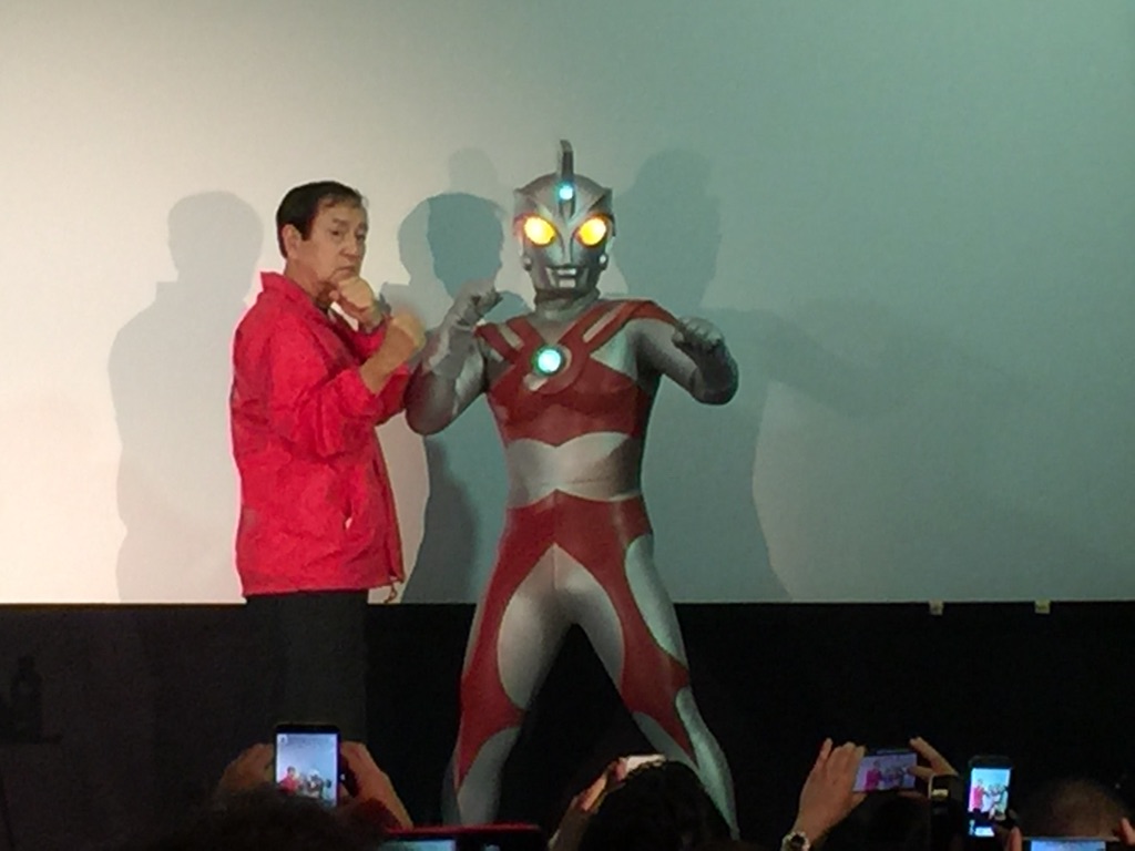 超満員、補助席も出る盛況ぶり、高まる鼓動にプレシャー。ま、まぶしい! 撮影用に設置された2頭のライトがまぶしい。そりゃキングコングもゴジラも光を当てて怒るわけだ。それに舞台に上がってかなりの緊張、さらには高峰氏、つまりはウルトラマンAを前に大緊張。