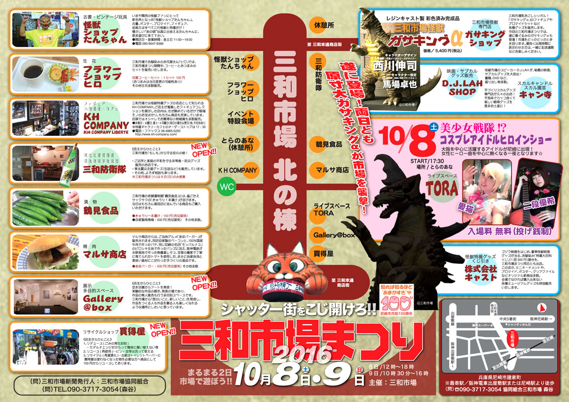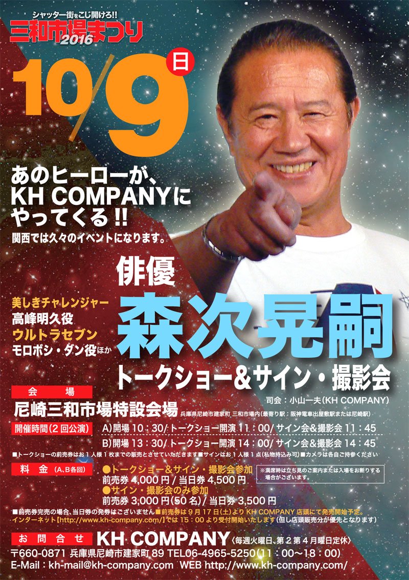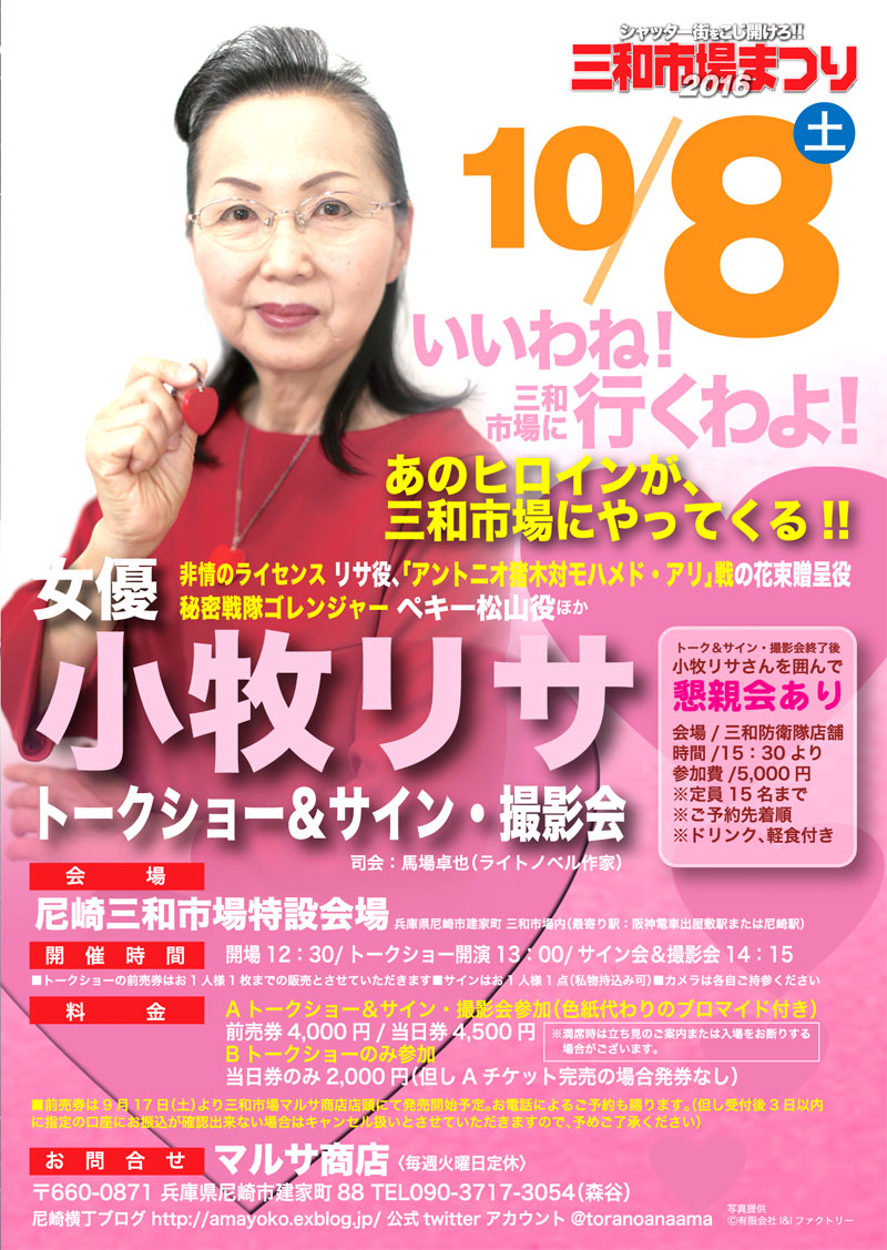 PR 先週末は尼崎市制100年を記念して三和市場が開催されました。シャッター商店街も初めに行った時よりも店舗が増え、賑わいを見せています。今回のイベンの目玉は何といってもモモレンジャーこと小牧リサさん、そしてモロボシ・ダンこと森次晃嗣さんのトークショー。