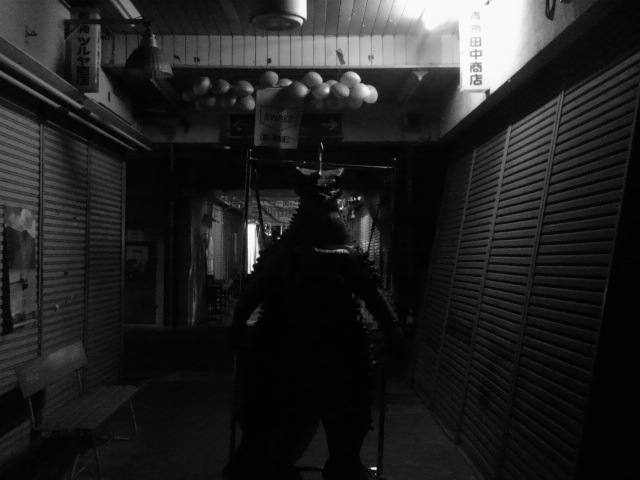 その過程で設定と名称を考えさせてもらった身としては感慨深いものがありました。どうせ祭りだ、ただの客で終わりたくない、何かやらないと、と思い開催の2日前にふと、『シン・ゴジラ』の牧教授、『メカゴジラの逆襲』の真船博士のことを思い出し、怪獣に名前を付けた博士、という設定で白衣を着てぶらぶらしてました。そうすることでどうにかなる、というわけではないのですが、やらずに後悔するよりやって後悔する方がいいと思ったもので。ちなみに後悔はしてない。これからもお呼びがあればガサキングαと共に出現したい、と思う所存であります。それよりも、お客さんがちゃんと『ガサキングα!』と呼んでくれたり、ちびっ子が恐々ガサキングに接したり、と徐々に地元に根付いているように見えたのがとてもうれしかった。