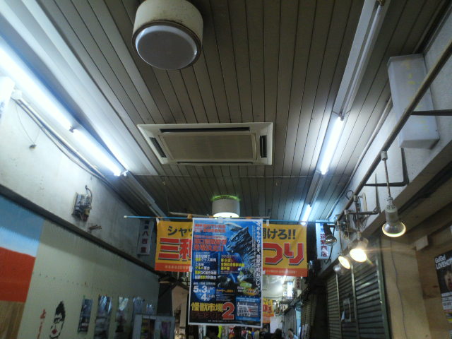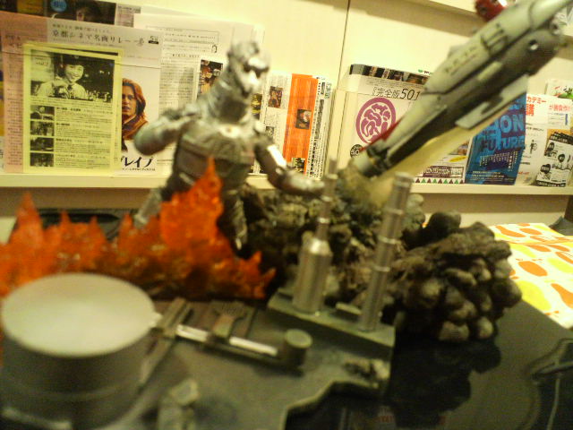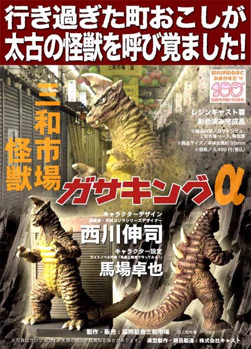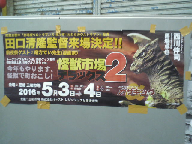 そして翌日は恒例、怪獣市場DX、の前夜祭。寝屋川でダラダラやってるババジラジオを尼崎のイベントにぶつけるという無謀っぷり。大丈夫なのか? 今回は漫画家緒方てい先生をゲストに迎えるという、普通のトークイベントの体裁をとってみる。ふたを開ければほぼ満席。常連さんやそうでない人でごった返す場内。いいのか、こんなことで。いつもはだらだら10人弱ぐらいの前でやっているので、緊張する……ことはなく、いつものようにおもちゃを出してだらだら喋ったり、気まぐれにお便りを読んだり。まさか超獣トークに花が咲くとは思わなかった。 そして、半ば飛び入り上映の『行け!般若マン』にも救われる。緩い特撮ヒーローものであるが、妙に主題歌がしっかりしている。場内に巻き起こる黒い笑いは、いつか見た自主映画上映会で巻き起こるそれと同じだった。オタクの根は変わっていない。緒方先生と、般若マンの清洲監督に感謝の夜。 その後、軽い打ち合わせをしての帰り道は土砂降りと強風で死ぬかと思った。 翌日はあの、『ウルトラマンX』のメイン監督、田口清隆氏を迎えてのトーク。だからいいのか、自分で? 自分がやれることは相槌を打っておもちゃを並べるしかない。監督とサポート役の島崎氏に救われた形になる。しかし、中学時代にウルトラマンのお面でごっこ遊びみたいな映画を作ってた人が、本物を撮ることになるとは。だから田口監督は全国に多数いる自主特撮映画人のあこがれなのだろう。 トークの後はサイン会に、田口監督自ら演出する即席映画撮影。狭い商店街を、即席エキストラ200人が逃げ惑う。襲い掛かるは、三和市場の生んだ大怪獣ガサキングαだ。自分が設定を考えた怪獣に襲われるとは、フランケンシュタイン博士の気分であるが、そんなに大層なことでもないか。