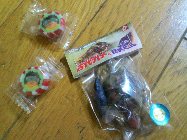 今回の入場者特典はポーラーボーラのチョイ役の古代ガメと巨大ビル。そしてなぜか村瀬氏の金太郎飴を頂く。