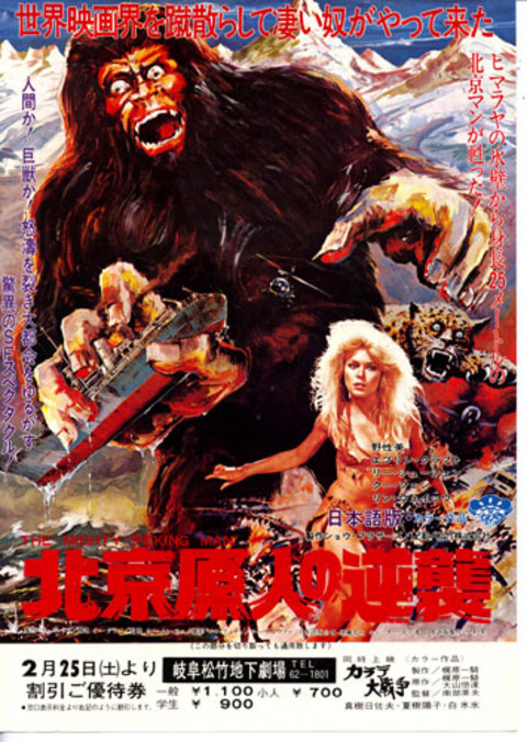 ・立体起動装置とは? うーん『特撮はすごいけどドラマは……』とはよく言われますが、そうならないぐらいに押し切れる勢いが欲しかったのですね。ゴジラもパシフィックリムもそれがあったように思える。だから中盤の修学旅行がなあ……。 でも、後半戦は楽しみです。ラストのあいつがいるお蔭で生々しいヒーローものというか、怪獣物としての個性が立ってきそうなので。 ・大特撮戦争映画祭NIGHTから一週間。そして再びやってきた京都みなみ会館。今回は合作怪獣映画特種と称して『北京原人の逆襲』『極底探検戦ポーラ-ボーラ』の二本立て。円谷英二の意志を受け継いだクリエイターたちが奇しくも70年代後半、香港、アメリカで、その腕を存分に振るった作品たちである。