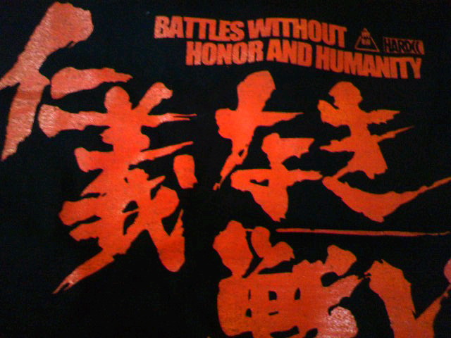 さらにプレゼントで頂いた『仁義なき戦い』Tシャツ。『柳生一族の陰謀』『ガンマ第三号』と、今秋、みなみ会館では深作欣二作品の上映があるので、覚えていたら着ていこう。