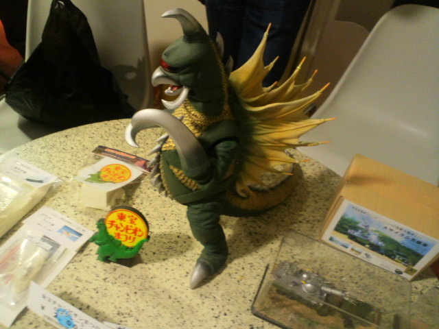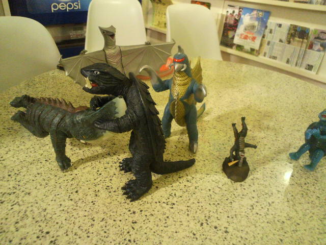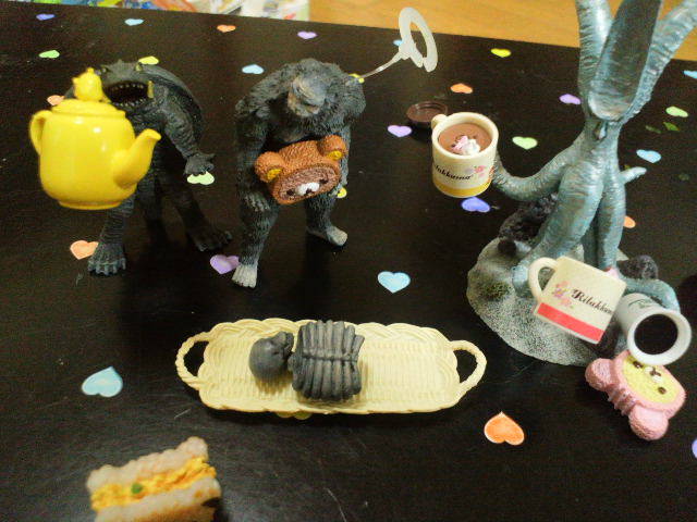 翌日、娘はくじで取った雪男を並べたりして遊んでいた。彼女にとってはギロンより、ガイガンよりも雪男が一番気になったのかもしれないゴホ。