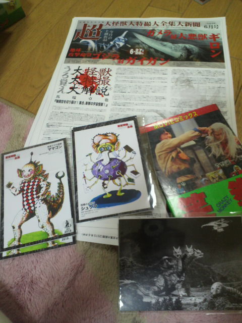 ガメラはしょっちゅう流血するが、ゴジラも今回で初流血。 そして、今回も大怪獣新聞に記事を書きました。円盤と少年、といえば、甲府UFO事件ですが、あまり関係なかったかも。おなじみの怪獣くじで、娘は獣人雪男をゲット。毎度毎度恐るべきくじ運である。それと、ロビーの映画書籍コーナーで購入したのは『笑拳』フィルムコミック。