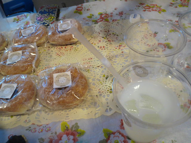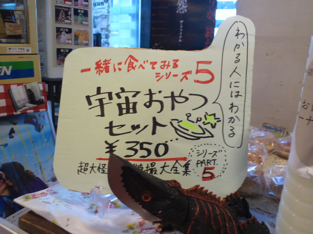 ロビーでは恒例、劇中を再現した食べ物の販売、今回は『ギロン』で第十惑星人が作ったドーナッツとカルピスっぽい白いジュースだ。