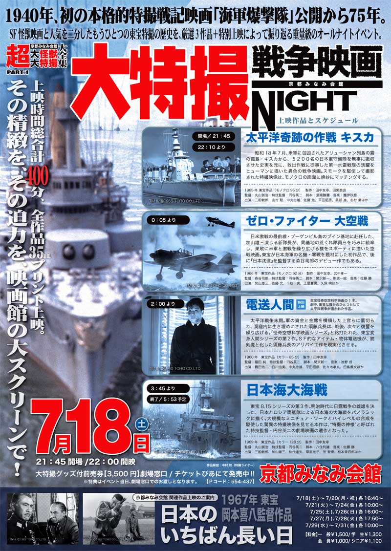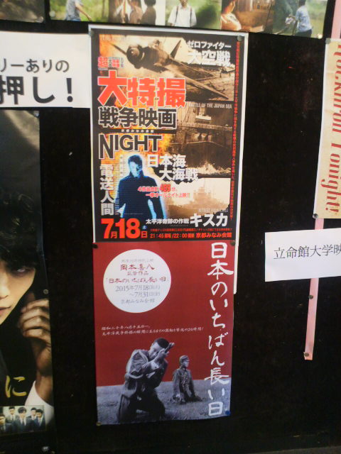 今回は『太平洋奇跡の作戦キスカ』『ゼロ・ファイター大空戦』『日本海大海戦』それに『電送人間』の4本。しかし、昨日よりみなみ会館ではリメイク版公開に合わせ岡本喜八版『日本のいちばん長い日』を上映するとのこと。こりゃ大変だけど、全部見ると大変だな、と思っていた当日。頭の中の誰かが『ユー、まとめて見ちゃいなよ』と囁いたので、車に飛び乗り、京都へ。