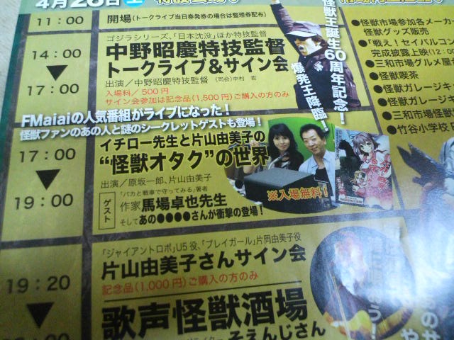 いよいよ本番の日……ゴジラシャツにガメラジャンパーという『外では変人扱いだけど、怪獣イベントだから、これは正装』に着替え、子供を車に乗せ、ポン友で、作家街道驀進中のソラノ先生を途中でひっかけ尼崎へ。