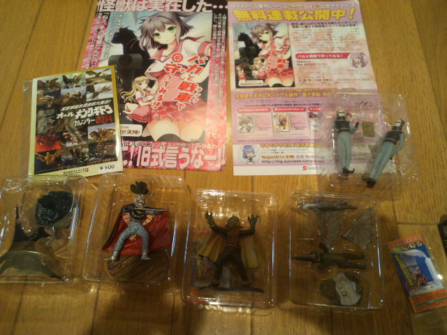 その日の収穫は『本来外れであるはずのクリスタル版が出たらパイラ人と交換するよ!』ということで買ってみたら全部色付きで、それはそれで嬉しい『特撮大全集3』と、X星人にキングギドラカレンダー。そして『バカ戦』チラシ。