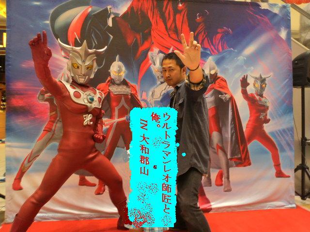 ここから本題。奈良から枚方に向かう途中立ち寄ったイオン大和郡山店。連休なので、子供を集めたイベントをやっているなあ、と思ったら、それがウルトラマンだった。内容は、パネル展示と、怪獣を模した遊具にスタンプラリーというこじんまりしたもの。しかし、スタンプラリーには目のない子供らは台紙をもらうとすぐに、店内を駆けていった。 ちょっとした宝探し感覚がいいのかもしれない。 そして、イベントのメインはウルトラヒーローとの撮影会。その日はレオの登場だった。他の兄弟はイベントでよく見るが、レオは珍しいのではないか? 司会のお姉さんとちびっこのコールで、赤い炎をくぐってやがて現れるウルトラマンレオ。 俺は娘を連れて撮影会の列に並んだ。初めは嫌がっていた娘もほかのちびっこに触発されてか、次第に乗ってきた。よし、矢追スペシャルや宇宙人ポールどころではない、俺は今から本物の宇宙人(獅子座L77星人)と写真を撮るのだ!