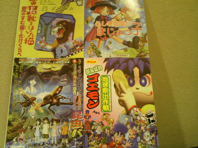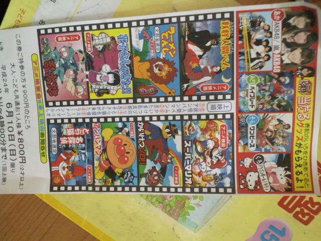 伸びきった庭の草むしりを終え、心地よい疲労感でひと汗かいて、休日をゆるりと過ごす……わけにもいかないのですな。 ・学校の下校時、知らないおじさんが校門で映画の割引券を配っていたという経験はないでしょうか。 それが映画館でかかっている大作や有名どころじゃなくて、アニメや特撮ものなど中短編をまとめ、近所の公民館やホールで一日限定で上映するイベント。全国的にあったかどうかは分かりませんが、少なくとも私の住んでいた和泉市や和歌山市では不定期ながらそういったイベントが催されてました。 見たい作品もあるけど、見たくないのもあるなあ、と思いながらついぞそんなイベントを見に行くということはありませんでした。 今思えば『ゴジラの息子』というメジャーから、『怪獣王子』『白獅子仮面』の1エピソードなど『見ておけばよかった!』と思うものもありました。あぁいう催しは一体どこの誰が行っているのでしょうか? 巡回映画をメインにおく映写会社が中心になって行っていたのでしょう。私も短期間ですが、野外上映やイベント上映を主にする会社でバイトしたこともあり、そういうものかな、と思っていました。 で、そういったイベントがすっかり絶えたと思っていたら、そうでもなかったのです。 先日、子供が学校でもらった、一枚の割引券を持ってきました。 おぉ、懐かしい。いつのだ? しかし、割引券上部に『AKB』や『嵐』の文字があることから最近のものと分かります。まだやっていたのか!と白々しく驚いてますが、実はそれ以前も子供が割り引き券をもらっていたことがあり、そういった上映会自体まだ健在ということは知っていました。しかし、日程が合わなかったりしていけずじまいでした。 あぁ、スクリーンで見たかったなあ『ドロロンえん魔くん』。 そして今回、特に予定もなかったので、ついに上映会に出かけることになったのです。 しかし、ラインナップを見ると、ちびっ子向けばかりであまり興味を引く作品がないな……いや、よく見れば『妖怪人間ベム』があるじゃないか。おっさんホイホイか? うちの子供に、その友人を引き連れ、会場へ。子供達の目当ては『スーパーマリオ』らしい。 割引券を見せて中に入ると、ちびっ子たちにくじ引きのサービス。 そこでもらった『三共教育映画社』のアニメラインナップ。裏面は時間割になってます。左下の昆虫アニメがとても気になる。詰め込みすぎだろ。 会場となった和泉市のホールは大入り、と行かないまでも9割の入り。 すでに上映は始まっており、『アンパンマン』の真っ最中。 全部で8本立てを2時間で済ませられるのか? と思ったのですが、中短編織り交ぜてるので、何とかなりそう。 スクリーンに見入る子供達は画面に素直に反応しており、笑い声や嬌声の絶えない会場でした。それでいて、わずらわしいとは思わない。こんなのなんだか久しぶりだ。 あらかじめ2時間で終らせるために、作品のほとんどがオープニングをぶった切って一本のリールにまとめていました。フィルムゴミがちらつく映画を見るのもなんだか久しぶり。 途中で一度だけ入った休憩時間には、ロビーで駄菓子屋さながらの駄玩具の販売が行われていた。アイドル生写真やら、アクセサリーやらである。今の子供達もそういったものに群がってくれるのでなんだかほっとした。 休憩を挟んでいよいよお目当ての『妖怪人間ベム』の上映。いくら実写ドラマで見た子供も多いと思うが、ここで泣き叫ぶがいい! いつものオープニング曲、おや、なんだか曲のテンポが違うぞ? それに続き映し出されたタイトルは『妖怪人間ベムパート2』! なに? パート2だと? これってパイロット版だけ作ってお蔵入りになったあれか? えらく貴重なフィルムじゃないか。(後年CS放送で作られたリメイクとは別) 見てみると、なんだかキャラが以前の切り絵のようなカクカクした感じから、なんだか丸っこくなったり、戦闘シーンでアップテンポの曲が掛かったり、演出や効果も80年代風な味付けがされていた。でも、妖怪人間の指は三本でした。 それに続く『かいけつゾロリ』は、サンライズ製のテレビ版かと思いきや、それ以前に作られた短編でした。原作準拠のまがまがしいキャラデのゾロリ、ちっとも可愛くないイシシ、ノシシがギクシャクと活躍していました。その『コレジャナイ感』に場内はざわついていました。これもまた素直な反応。 そしてトリを飾る『スーパーマリオ』ですが、これがかつて劇場公開されたアニメ版かと思いきや、あのハリウッド版……でもなく『マリオの白雪姫』という作品。名作童話をマリオのキャラたちで演じているという一遍でした。 白雪姫はピーチひめ、悪い女王はクッパ大王、七人の小人はキノピオで、肝心のマリオは白雪姫を組成させる王子様の役割、なんですが、それじゃあラストにしか登場しなくなるので、序盤からクッパの手下からピーチ姫を守るなどの大活躍。姫様をピノキオの家