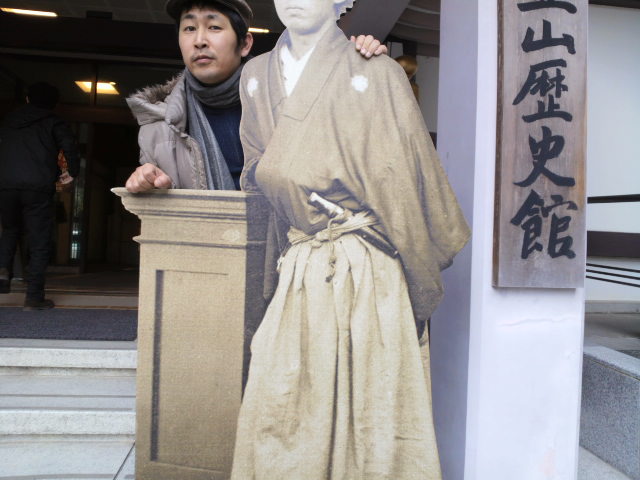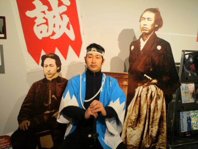 とりあえず、竜馬さんには『誕生日、近いっす。俺もがんばります』と、手を合わせ、次の目的地『幕末維新ミュージアム霊山歴史館』へ。 さっきまで倒幕の火種を作った人物に手を合わせ、今度はその天敵ともいうべき幕府の手先に扮装するとは。平和だなあ。 しかし、ムチャな組み合わせだ。