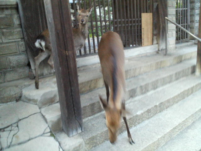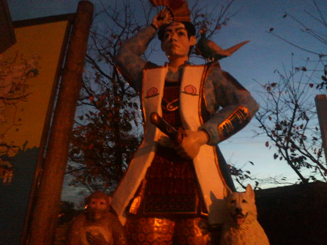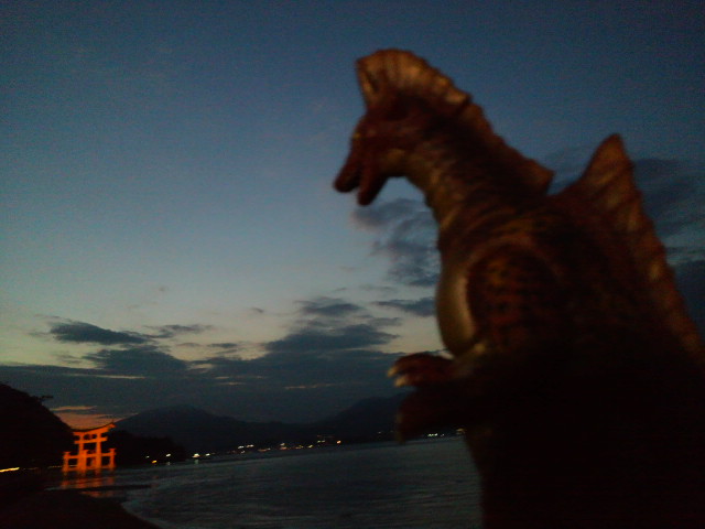 そう、歳だった。翌日の朝。ゲストハウス菊がわにて、銀河帝国ザンギャックのワルス・ギルの最期を見届けながら、その日が自分の誕生日であることを思い出した。旅先で誕生日を迎えるのは生まれて初めてだ。 先週末、広島へ行って参りました。思えば、宮島文庫で入賞し、授賞式で訪れたのがきっかけで、家族で『また行きたい』という声が上がっておりましたので、何とか宿を取ることが出来たのです。うちの家族は一度気に入ると、近いうちに二度目に行くのが習慣のようになってまして、三重、名古屋に続く『お気に入りの街』になってました。 その前に。出発日の朝『怪獣大奮戦・ダイゴロウ対ゴリアス』『直撃地獄拳・大逆転』のDVDが届いた。 どちらも我が心の映画。怪獣も人間も根っからの悪党がいない牧歌的かつリアルな『ダイゴロウ~』と、どいつもこいつもこずるくて悪党(そしてバカ)ばかりの『大逆転』、いい年した男たちが己の信念を貫き通すファンタジーだ。 そして続いて『将軍コレクション』が届く。北米版DVDで、千葉真一主演の時代劇を四本セレクトしている。アチラは、すぐ関連性のある作品をセット売り、ボックス売りしたがるが、そのチョイスがたまによかったりするので、見逃せない。内容は『将軍家光の乱心・激突』『柳生一族の陰謀』『赤穂城断絶』『忍者武芸帖・百地三太夫』。どれもこれも、千葉ちゃんは脇役で、しかも将軍ではない。将軍様がメインで出るのは『激突』ぐらいでは? いやしかし、この強引さと作品チョイスがいいのだ。 これらをまとめて見たかったが、出発の時間だ。妻の実家の枚方から23時30分に出発。一時間しないうちに眠りだす家族、そして妻の両親。結局深夜の一人ドライブだ! しかも山陽道は霧が立ち込めている、危ない、 眠い! なので、サービスエリアでこまめに休憩を取りながら、のろのろと西へ。 睡魔が襲ってきて、いよいよ危なくなってきたので岡山県の吉備で仮眠。 外は満月でした。 6時起床。座席でもガッツリ眠れるものだが、隣の車が一晩中エンジンをかけており、その音が気になってしかたなかった。 ベロクロンが襲った町、福山市で朝食を取り、広島へ。 今回の旅行の目的は三つ。まずはそのうちの一つ、長男の『ズッコケ三人組像を見たい』という要望にこたえるため、西広島駅へ。『ズッコケシリーズ』はこの街がモデルとのこと、偶然だろうが近くにあったコンビニの名前は、『ズッコケ』の版元と同じ名前の『ポプラ』。 広島なので、カープっぽい帽子で。 続いて、二つ目の目的、前回ふらりと立ち寄った横川駅近くのおもちゃ屋へ。『こ、これは!』と思うものにめぐり合えず、残念。チェックインまでまだまだ時間があるので、南区民センターへ。偶然にも、そこで行われているサブカルイベント『あにこむ2011』に、『宮島文庫』で俺の作品を担当していただいたイラストレーターの炉火さんが来られているということで、ご挨拶に。 会場のエレベーターを降りると、いきなりコスプレさんたちが。国際アニメーションフェスティバルに端を発し、今回のようなイベントなど、広島はサブカルチャーに対して積極的に盛り上げていこうとしている。宮島文庫もその一環だ。宮島の神が取り持つ縁か。 イベント会場だったこともあり、おどおどしつつ炉火さんにお会いし、お礼と、あつかましくもサインのお願い。サインの代わりに生イラストをいただく。 お邪魔してはいけないので、そそくさと家族が待つ車へ戻る。あぁ、挿絵の原画、一枚もらえばよかった、と少し後悔。 昼飯がまだだったので、本通り商店街へ。初めは広島焼きを、と思ったが、見つからなかったので、麦とろ定食を。そこでもおもちゃ屋に立ち寄る。デッドストックなど、魅力的なものや、プライスダウン商品も数多くあったが『これは!』と思うものが、見つからず。通りから外れた巨大ブックオフもまた同様。って、大阪とやってること変わりませんな。 広島の動脈ともいうべき国道二号線を行き来していたのだが、今回も原爆ドームは見えず。代わりに、広島城は見た。 そろそろいい時間なので、バイパスに乗って廿日市市へ、そこで、前回同様フェリーに乗って宮島へ。神の住む島、そしおて行ったことないくせに小説の中で滅茶苦茶にした島。そのおかげで呼ばれることになった島である。フェリーを降りると、おみやげ物売り場で『宮島文庫』発見! 今回の目的の三つ目『宮島文庫が売られているのを確認する』をクリア。 まずは旅館にチェックインし、散策に。 表通りから外れた旅館で、借りた部屋は大人数用に、ロフトのあるおしゃれな部屋。子供たちはもちろんロフトに登り、ばんばん物を落として遊んでいた。 宿を出るとすぐに鹿の出迎え。ここは神と鹿の住む島だった。 夕陽差す厳島神社の大鳥居。 日が暮れると潮が引いて、干潟に下りることが出来た。 夕食を食べ始める頃から、体が熱く、意識が朦朧としてくる。仮