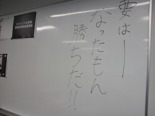アレは先月のこと。空埜一樹先生の知人で名古屋在住の漫画家・結城さくや先生が大阪に遊びに来られるというので、酒席にお邪魔した時の話。 結城先生は名古屋の専門学校で講師をされているとのこと。 『来年度、ノベルス学科ができるんですよ。どうです?』 『へえ、面白そうですね。名古屋かあ』 とか何とかやり取りがあって数日後。その専門学校の校長からじきじきにお話があって。 先週末名古屋に行ってきました。 行き先は日本マンガ芸術学院! 色々あって(本当に二転三転したんですよ)、新幹線で行く予定が、こちらの事情で車で。 行きなれた名阪国道を抜けて、東名阪に入って名古屋へ! アホみたいに晴れ渡った空。よく見れば左斜め上に巨大な忍者が。伊賀越えの最中だ。 一人きりのドライブなので、休憩なしのノンストップ、と行きたかったが、四日市を過ぎた御在所SAでトイレ休憩。ここまで約二時間。そこから30分ほどで名古屋市内へ。思ったより近かった。 時間があったので、市内を車でうろうろ。 名古屋といえば『モスラ対ゴジラ』『ゴジラVSモスラ』『ガメラ対ギャオス』と、怪獣が蹂躙した街でもある。三作品に共通して襲われた名古屋城を見物に行く。 名古屋城とバトラ。小さいので見えにくいが、奥に名古屋城が。 中村公園前の大鳥居。現実の中の非現実、まるで怪獣だ。なんでも怪獣に見えてしまう悪い癖。 ぽつん、と立つねじくれ立ったビル。これも某専門学校とのこと。 更に市内をぶらぶら。事前にチェックしていた古本屋によってみたり、ここでもかよ! のブックオフに立ち寄ってみたり。あまり大阪とやってることは変わらんなあ。 ブクオフで買ったもの・その1 『ウルトラマンタロウ超全集』! 名古屋まできて買うものか? どこでも買えそうなものだが。いや、ZATの隊長は名古屋章だぞ。何の関係もないけどね。 このムック、可能な限りタロウ怪獣の三面写真を載せているところに魅かれた。 誰も知りたくない酔っ払い怪獣ベロンの背面写真もあるよ。 さて。ただ校長とお話をしに名古屋に来たわけでもない。 せっかく来ていただけるなら、と講義をお願いされてしまったのだ。 まず初日は、在校生の皆様にお話を。 コミックイラスト学科の学生さんがほとんどだったので、内容は こんな感じ。文章とイラスト、イラストレーターさんとのかかわりなどを著作を交えて。 授業の後、学生さんたちと雑談。場所が変われど、大阪の学生さんも名古屋の学生さんも根っこは一緒だなあ、と思った。 夕食までに少しばかり時間があったので、名古屋駅まで散歩。暑い。何でも名古屋は京都のように盆地帯なので、蒸し暑いそうだ。名古屋駅前は『小さき勇者たち・ガメラ』で亀とトカゲが喧嘩した場所でもあります。 名古屋駅前(というか厳密には裏通りだそうだ)には、コミック専門店やオタクな店が軒を連ね、日本橋のような雰囲気。地下街のおもちゃ屋に立ち寄って 非売品のゴジラとエビラのガレキを撮って、学校へ引き返す。カッコイイ。でも持ち帰るにはでかすぎた。だから非売品だといっておろうが。 その日の夕食。校長、事務局長にごちそうになりながら、延々『あしたのジョー』のお話を。力石戦もいいが、金竜飛戦、ハリマオ戦も大事なんだよ! あれ、学校の話は? 宿泊先は学校からビル二つ分隣の、ホテル兼果物屋という変わった場所。でもサービスでお皿一杯のフルーツをいただいた。 名古屋は城下町だったせいか、気温もそうだが京都のように碁盤の目に街が作られており、とても行き来がしやすい。とはいえ、そんなに動き回っておりませんが。 翌日は体験授業ということで、ほとんど高校生相手にお話を。 これですよ、これ。こんな大々的に発表するほどの人間ではにないと思うので、恥ずかしい。成瀬さーン! 『では、先にトークライブを』 え、トークでライブするの? 講義だけじゃない! 軽く打ち合わせののち、司会者さんのリードで、60人近い入学希望者(+その保護者)を相手にトークでライブ。事前に大量に口に入れていたミンティアが利きすぎてろれつが回らなく、ぎこちなくなってしまった。 ちなみに打ち合わせ中バックで流れていたのは、なぜか吉田拓郎の『唇かみしめて』。 自然に話は『刑事物語』、そしてハンガーヌンチャクの話題に。今の学生さんは武田鉄矢が昔ハンガーで人を殴りまわしていたことも、ハンガーが凶器になることも知らなかった。違う、木のやつ! 時代だなあ。 トークライブはそこで終わらない、続いては仙台の姉妹校とのストリーミング中継! ストリーキングではないのだ。ネット中継でお話しするというもの! 思いがけない質問攻めに戸惑いながらも、中継は無事終了。 司会役の声優学科の学生さんたちはみんなとてもはきはきと流暢にお話されるので、感心してしまった。 昼食で出されたお弁当はうなぎ+エビフライ+味噌カツという、実に名古屋らしい(失礼)、欲張りな構成。 休憩を挟んで最後に、ノベルス学科志