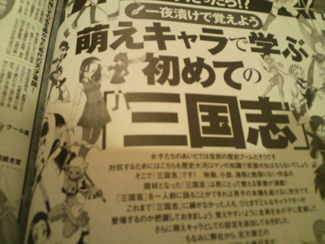 『もしもし、やります』 例えそれが苦手なジャンルでも、未経験のジャンルでも、どんな仕事でも受けるのが心情なので、編集さんや出版社さんからの電話にはこう答える。 『あの……三国志なんですが』 なぬ? あの、侠気と浪漫に彩られた、根強いファンの多いアレ? 『あぁ、やりますともさ』 ……と言うわけでにわかじこみの資料収集、それにファンが見たら卒倒&激怒しそうな内容の記事、これが俺の『三国志』だ、そしてごめんなさい! というわけで竹書房『特冊新鮮組DX 8月号』という雑誌に 『萌えキャラで学ぶ初めての三国志』という記事を書かせていただきました。 あの英傑たちを萌えキャラ化、という神をも恐れぬことをやっております。というか、すでによそでもやってますな。 この雑誌、もともとはグラビア系雑誌だったのですが、大人の事情で、雑誌コードはそのままに路線変更してアニメ、アイドル雑誌に。 要するにジャイアント編になった『シルバー仮面』のようなもので。ちがうな。 とりあえず、シリーズ化もあるかもしれないので、コンビニで見かけたときはよろしくです。 でもいまだに18禁コーナーだったりするのな。